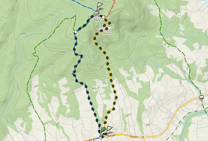 Na Luboń Wielki (1022 m n.p.m), który jest najwybitniejszym szczytem górskim w Beskidzie Wyspowym, nazywanym przez miejscowych Biernatką wiedzie kilka szlaków. Z samej Rabki-Zdrój Zarytego możecie dojść na szczyt trzema. Dzięki temu na szczyt możecie wyjść jednym szlakiem, a zejść drugim. My zdecydowaliśmy się wyjść szlakiem niebieskim, a zejść żółtym.