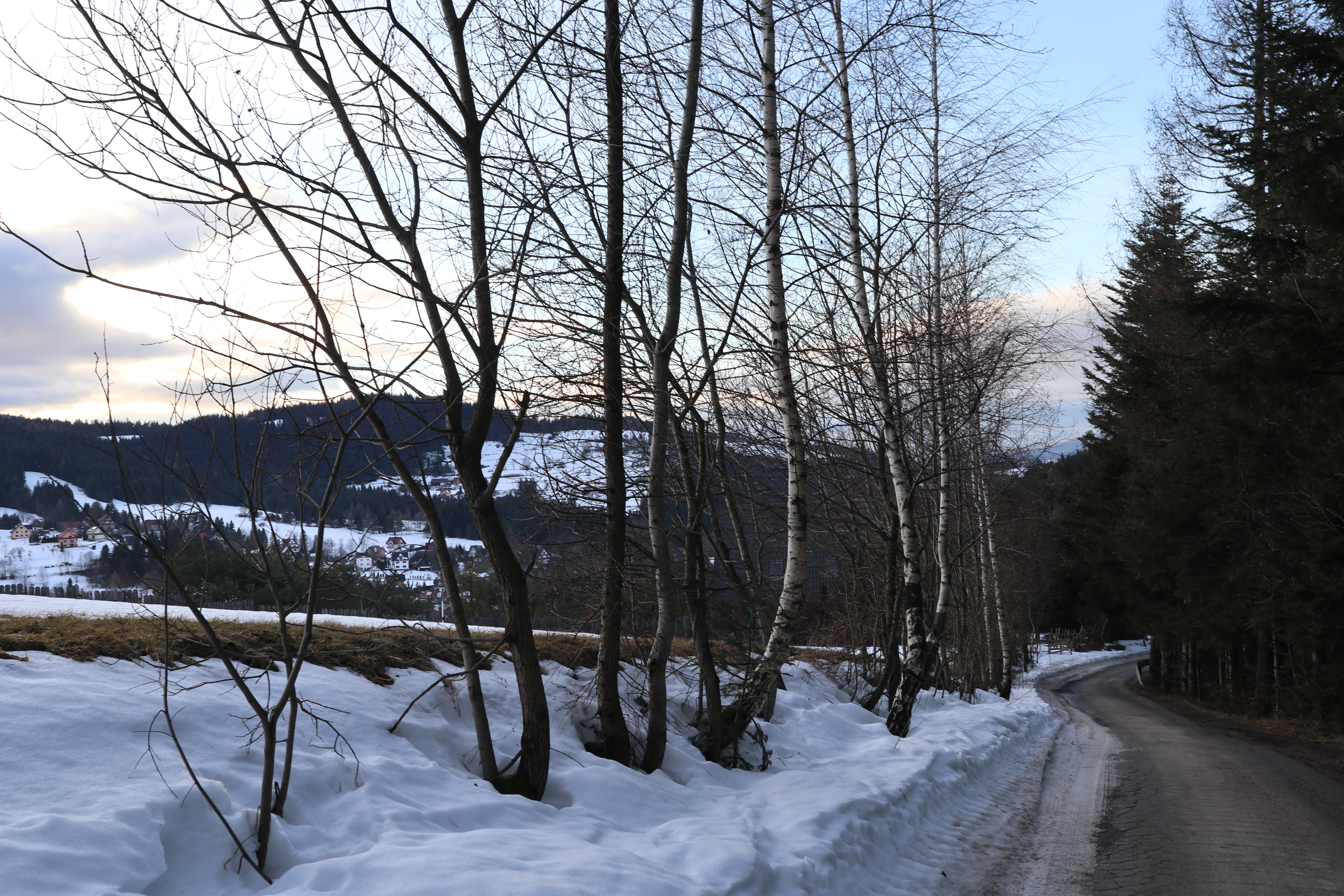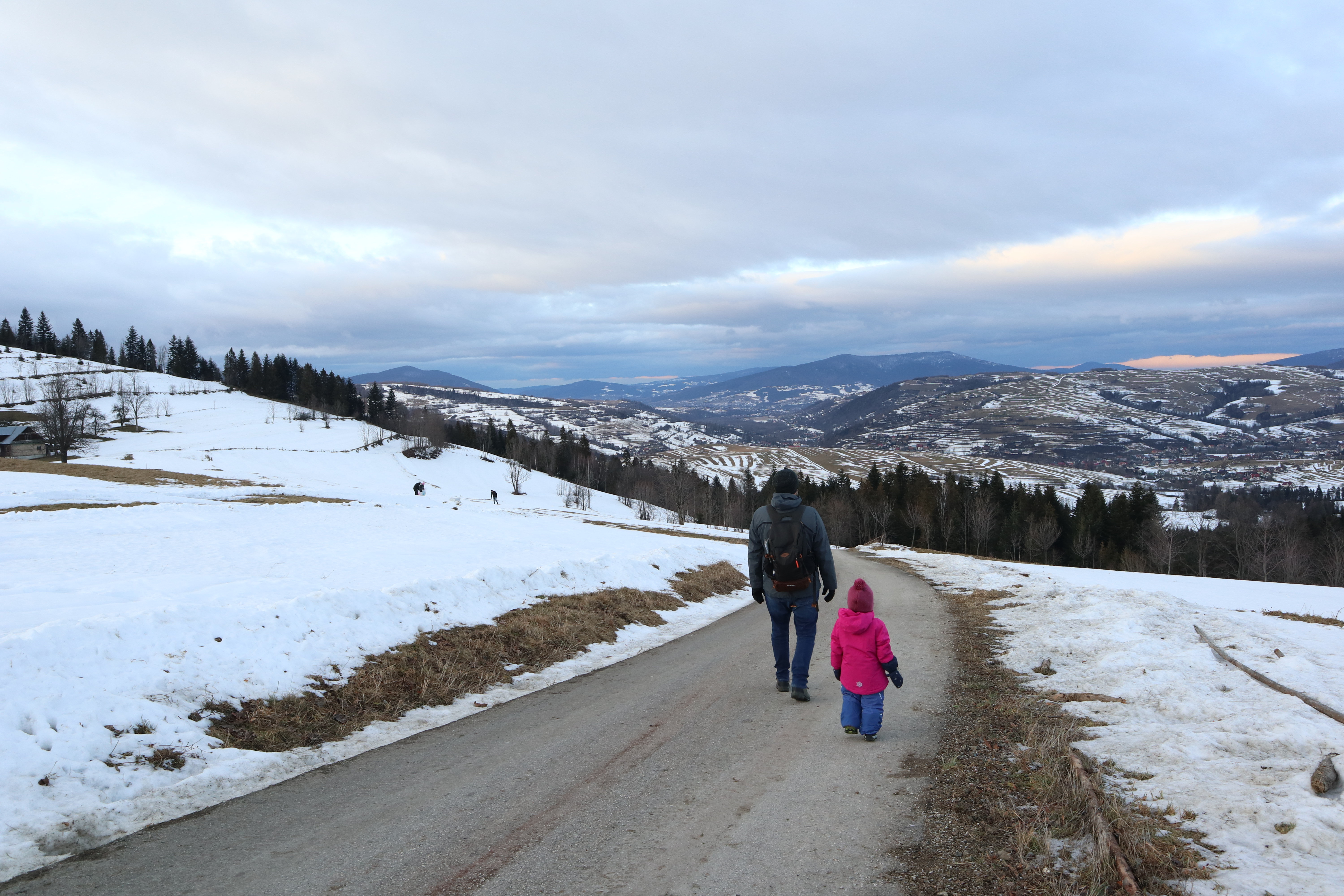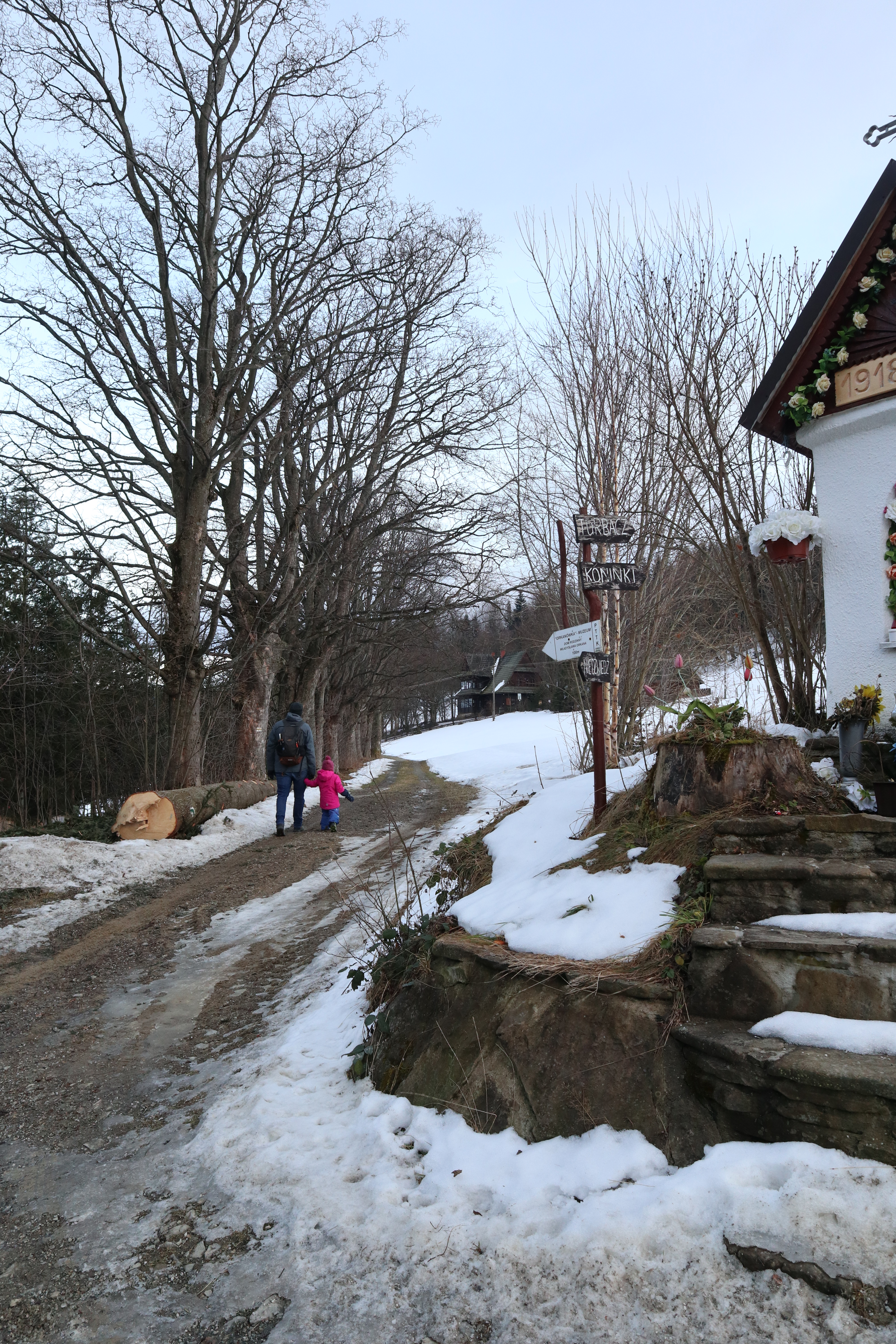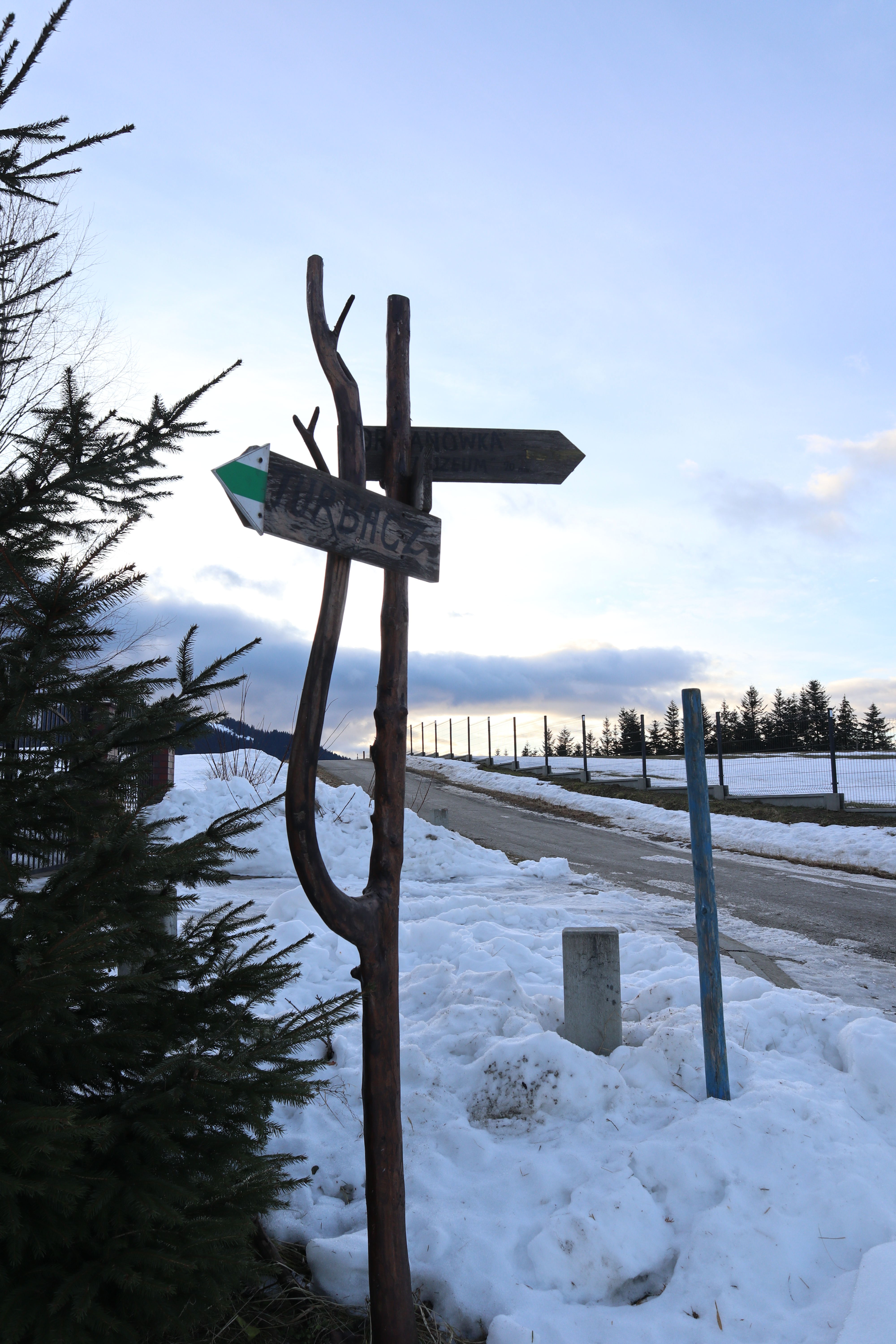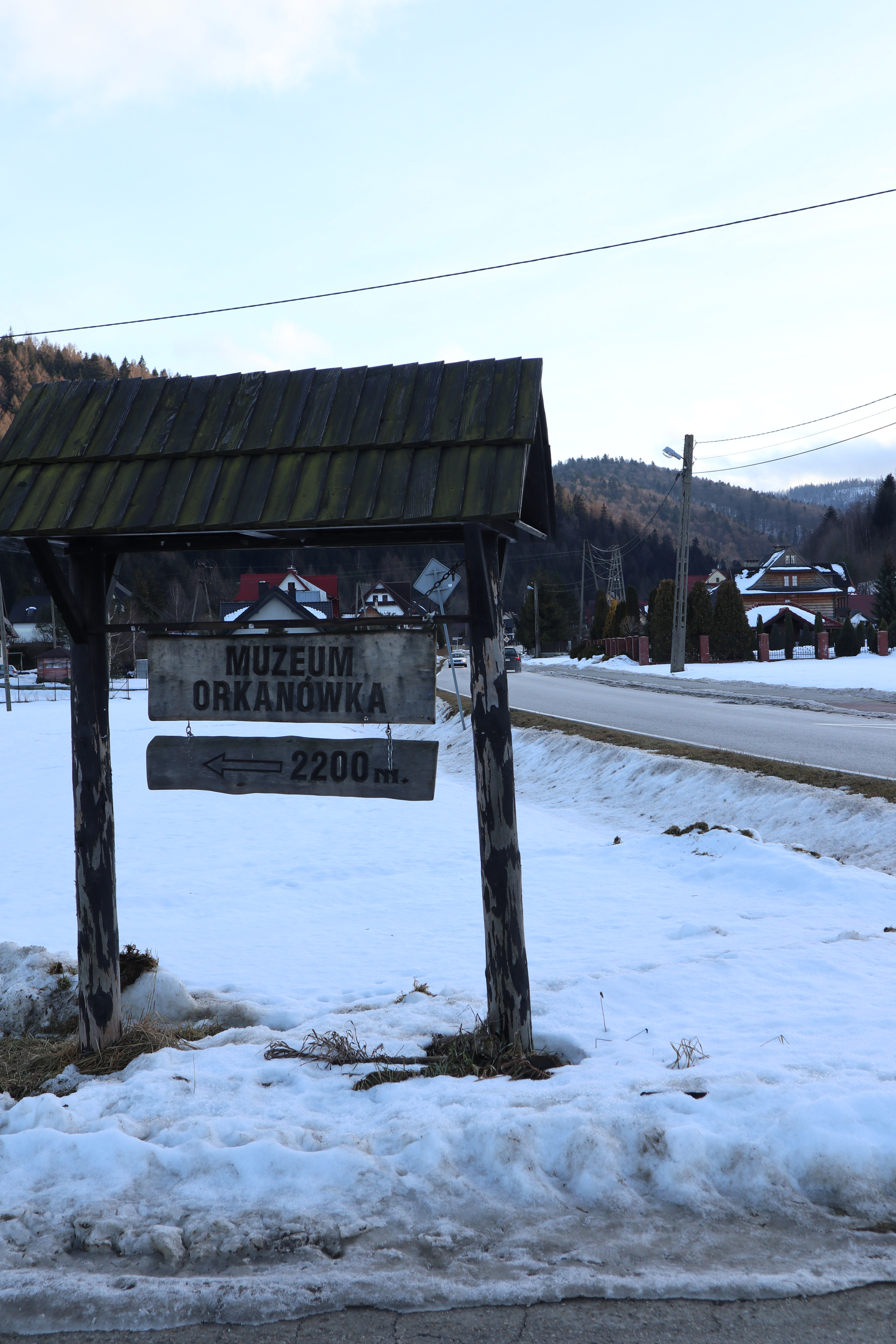 Wybraliśmy opcję żółtym szlakiem. Samochód zaparkowaliśmy na parkingu w Koninkach, z którego można się też wybrać na przykład na Turbacz, o czym już kiedyś dla Was pisałam: Gorce i ich król – Turbacz. Zaparkowaliśmy i główną drogą wróciliśmy kawałek w stronę Poręby Wielkiej. Po kilkuset metrach dotarliśmy do miejsca, w którym rozpoczyna się żółty szlak. Przy drodze jest też drewniany kierunkowskaz na Orkanówkę. W zasadzie, gdybyśmy wcześniej wiedzieli, pewnie skręcilibyśmy tutaj samochodem i za mostkiem pozostawili samochód.