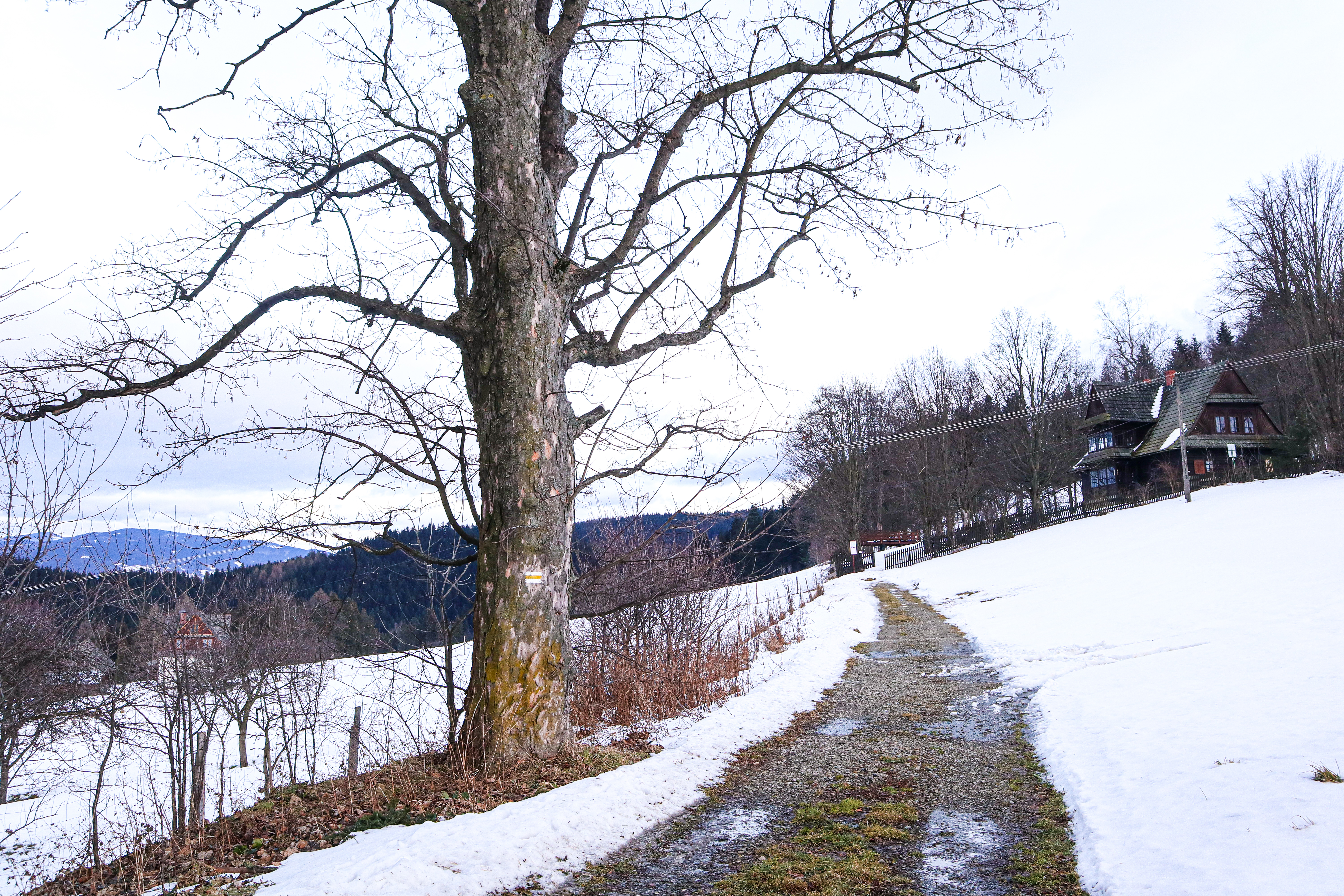 Trasa wiedzie cały czas asfaltową droga osiedlową. Jest to zatem idealna opcja na spacer z wózkiem. Choć początkowo idziemy wśród dość gęstej zabudowy, to im wyżej się wznosimy, tym domów jest mniej, a widoki coraz bardziej urokliwe. Nie będę ukrywać, droga stromo pnie się w górę. Naprawdę pięknie robi się w okolicy rozejścia się szlaku żółtego i zielonego. Zza drzew wyłania się widok m.in na Ćwilin. Idziemy dalej żółtym szlakiem. Już po kilku minutach naszym oczom wyłania się bajeczna panorama na Beskid Wyspowy. Od lewej widzimy Szczebel, Lubogoszcz, dalej Śnieżnica, Ćwilin, Łopień, Jasień i oczywiście królowa tego Beskidu – Mogielica. Jeśli wędrujecie tutaj wiosną, latem lub jesienią, to nie zapomnijcie zabrać koca i zróbcie sobie piknik z tym cudownym widokiem. Z tego miejsca do Orkanówki jest już bardzo blisko. Zeszliśmy bardzo stromą drogą kilkaset metrów, by potem skręcić w prawo w urokliwą aleję z dziesięcioma jaworami, które Orkan zasadził w podziękowaniu za szczęśliwy powrót z I wojny światowej. Alejka zaczyna się obok kapliczki wotywnej (takiej, która powstała jest w podzięce za wysłuchanie modlitewnego błagania) ufundowanej przez matkę pisarza z tego samego powodu.