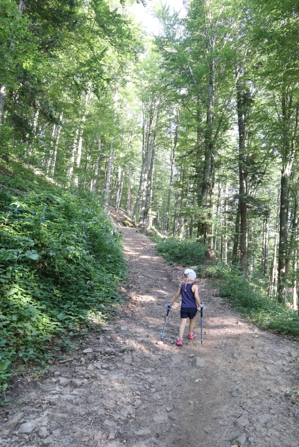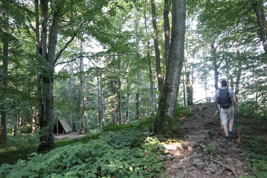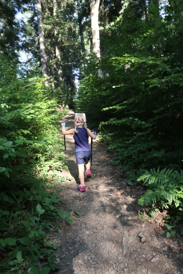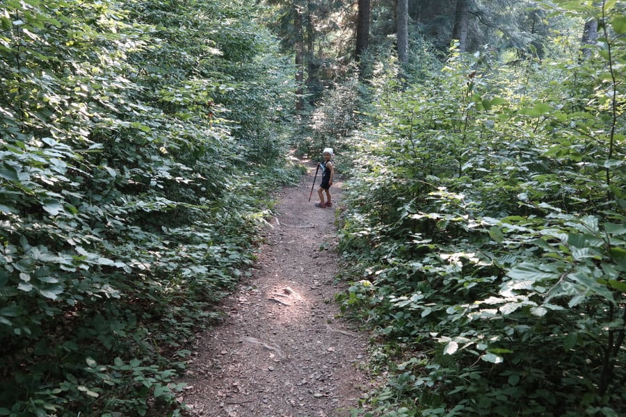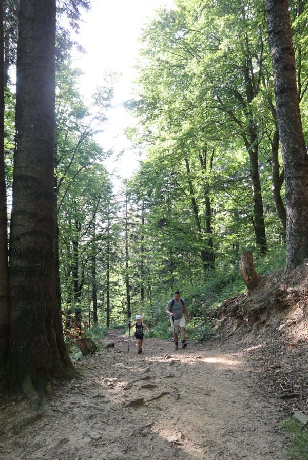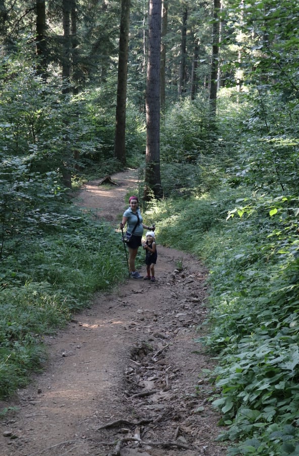 Do wieży widokowej można dotrzeć w około 45 min. Początkowo trasa ma specjalnie przygotowane stopnie z poręczami, które ułatwiają pokonanie stromych fragmentów zwłaszcza dzieciom. Dalej idzie się ścieżką przez malowniczy las. Nie jest to widokowa trasa. Mniej więcej w połowie pojawiają się ostrzeżenia o stromym zboczu. I fakt, zbocze jest bardzo strome. Ścieżka obok jest jednak na tyle szeroka, że nie musicie iść tuż obok urwiska. Cała trasa jest na tyle przyjemna, że nasza córka pokonała ją na własnych nóżkach w tę i z powrotem.