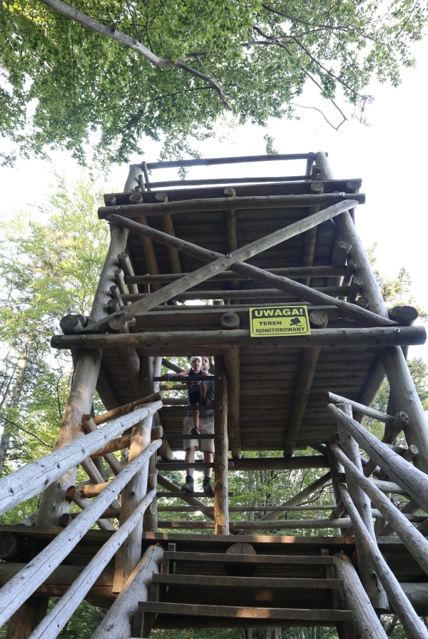 Wieża widokowa, czyli docelowy punkt naszej wycieczki jest nieduża w porównaniu z tą na Modyni, o której niedawno Wam pisałam. Ma trzy poziomy, z czego na dwa wyższe wychodzi się drabiną a nie schodami. Szczeble drabin są wzmocnione od spodu metalową konstrukcją, przez co są stabilne. Jeśli zastanawiacie się, czy dziecko da radę wspiąć się na samą górę, to od razu odpowiem, że tak. Oczywiście te mniejsze dzieci będą potrzebowały asekuracji dorosłego, ale skoro nasza 3-latka dała radę, to starszaki jak najbardziej.