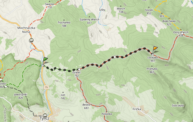 Mając Tylicz jako miejsce wypadowe na weekend, obraliśmy trasę rozpoczynającą się zielonym szlakiem w Mrokowcach (Mochnaczka Niżna). Nie ma tutaj parkingu, ale udało się znaleźć wolne miejsce tuż przy skręcie z głównej drogi w boczną przy szlaku. Wybrana przez nas trasa na Lackową liczyła 6,7 km i zająć nam miała według mapy ponad 2,5 godziny.