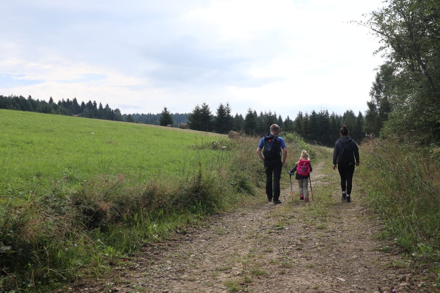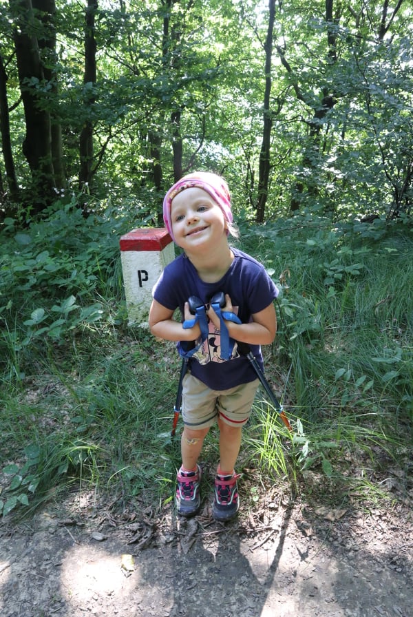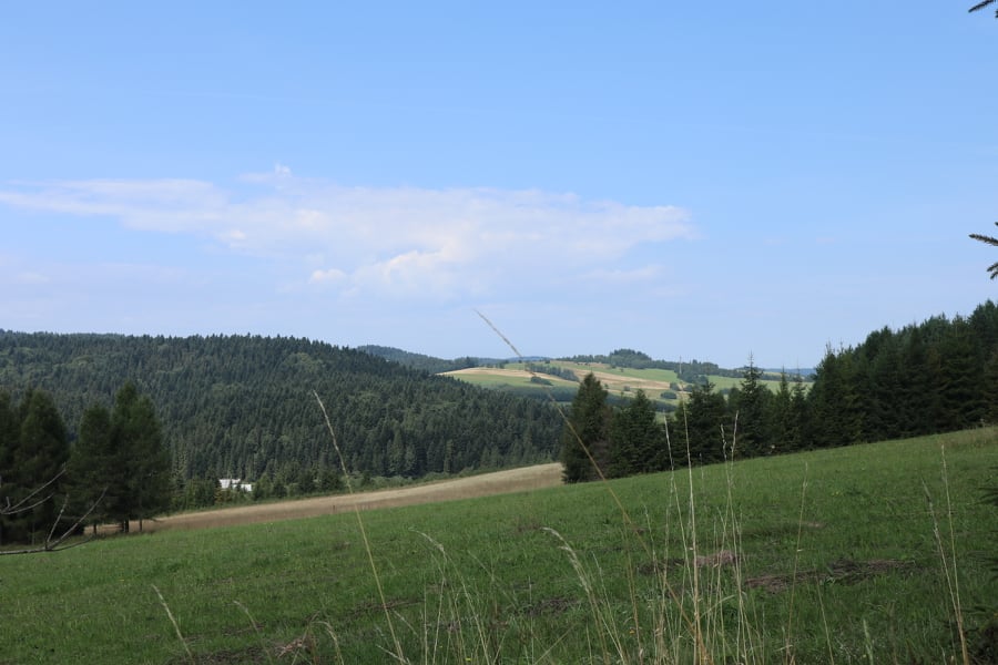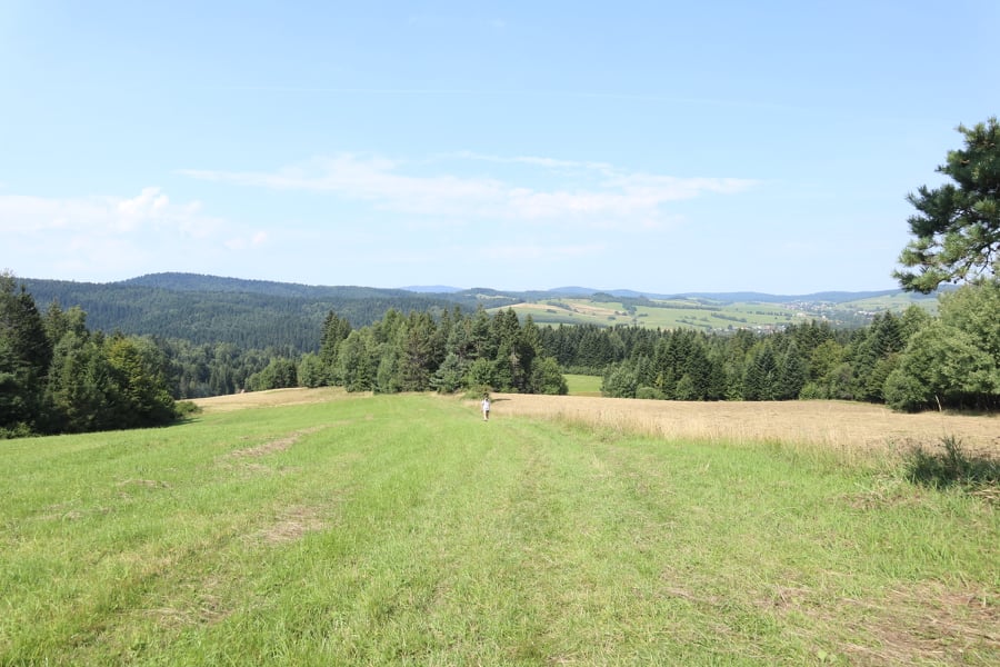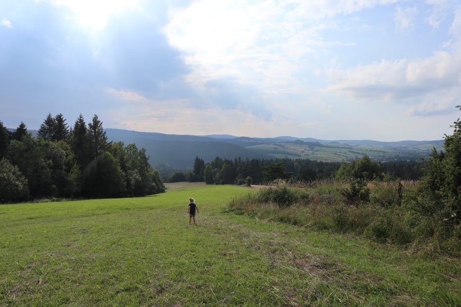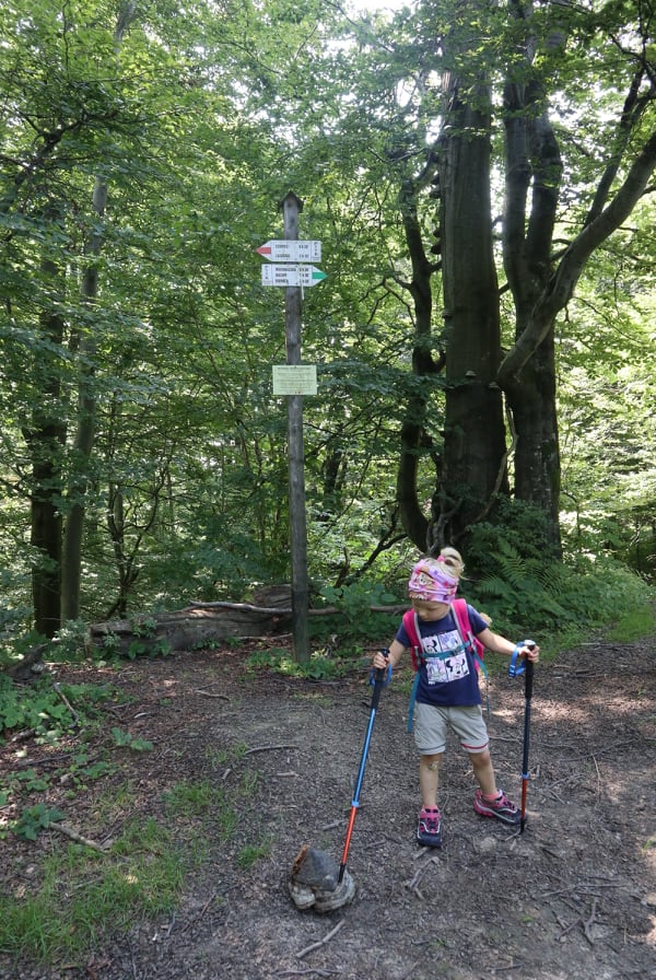 Na pierwszym etapie zielonym szlakiem udaliśmy się na Dzielec (792 m n.p.m.). Od razu powiem, że to najbardziej malowniczy fragment szlaku. Widoki są cudowne – tylko spójrzcie na zdjęcia. Sam szlak jest bardzo przyjemny i łagodny, lecz trochę zarośnięty na niektórych odcinkach. Bez trudu jednak pokonają go dzieci. Dałam radę też i ja w zaawansowanej ciąży (zaznaczam jednak, że nie mam przeciwskazań do wędrówek, czuję się dobrze i mam całkiem niezłą kondycję). Choć szlak na Dzielec raczy nas bajkowymi pejzażami, to sam szczyt jest już zalesiony. Tuż za nim około 100 metrów dalej dochodzimy do skrzyżowania szlaków.
