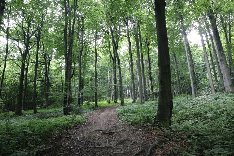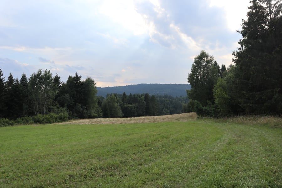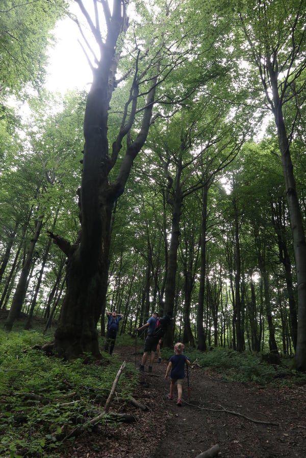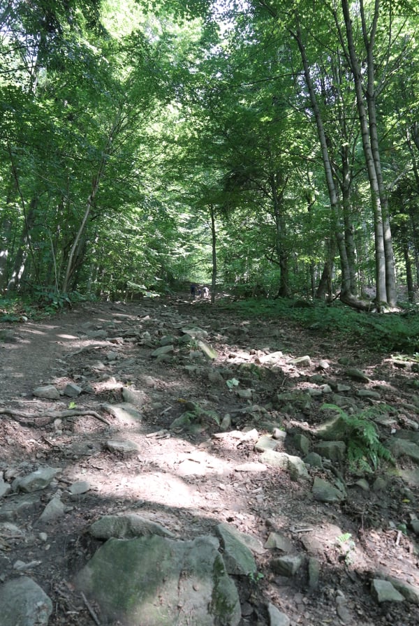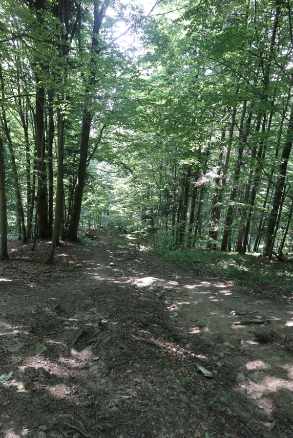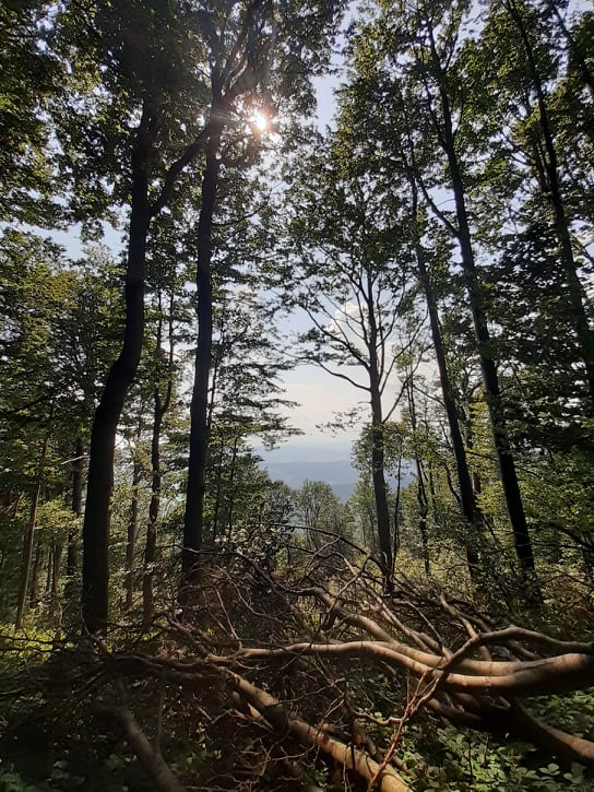 Na pierwszym etapie zielonym szlakiem udaliśmy się na Dzielec (792 m n.p.m.). Od razu powiem, że to najbardziej malowniczy fragment szlaku. Widoki są cudowne – tylko spójrzcie na zdjęcia. Sam szlak jest bardzo przyjemny i łagodny, lecz trochę zarośnięty na niektórych odcinkach. Bez trudu jednak pokonają go dzieci. Dałam radę też i ja w zaawansowanej ciąży (zaznaczam jednak, że nie mam przeciwskazań do wędrówek, czuję się dobrze i mam całkiem niezłą kondycję). Choć szlak na Dzielec raczy nas bajkowymi pejzażami, to sam szczyt jest już zalesiony. Tuż za nim około 100 metrów dalej dochodzimy do skrzyżowania szlaków.