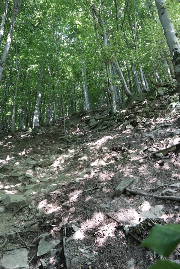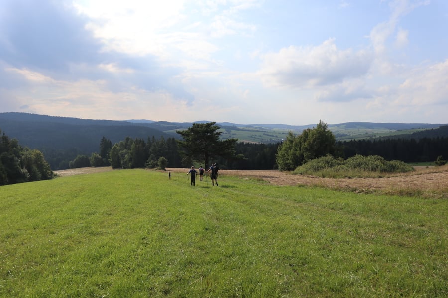 Tutaj kończy się szlak zielony, a dalej poruszamy się już szlakiem czerwonym, wiodącym wzdłuż granicy polsko-słowackiej. Szlak jest łagodny, a w końcowym fragmencie przez Przełęczą Beskid schodzi w dół. Na Przełęczy Beskid pozwoliliśmy sobie na chwilę przerwy, bo wiedzieliśmy, że już za chwilę rozpocznie się strome podejście na Lackową – ściana płaczu. Ponoć tak ostrego podejścia w całej Koronie Gór Polski poza Rysami nie uświadczycie. Sami spójrzcie na profil trasy: