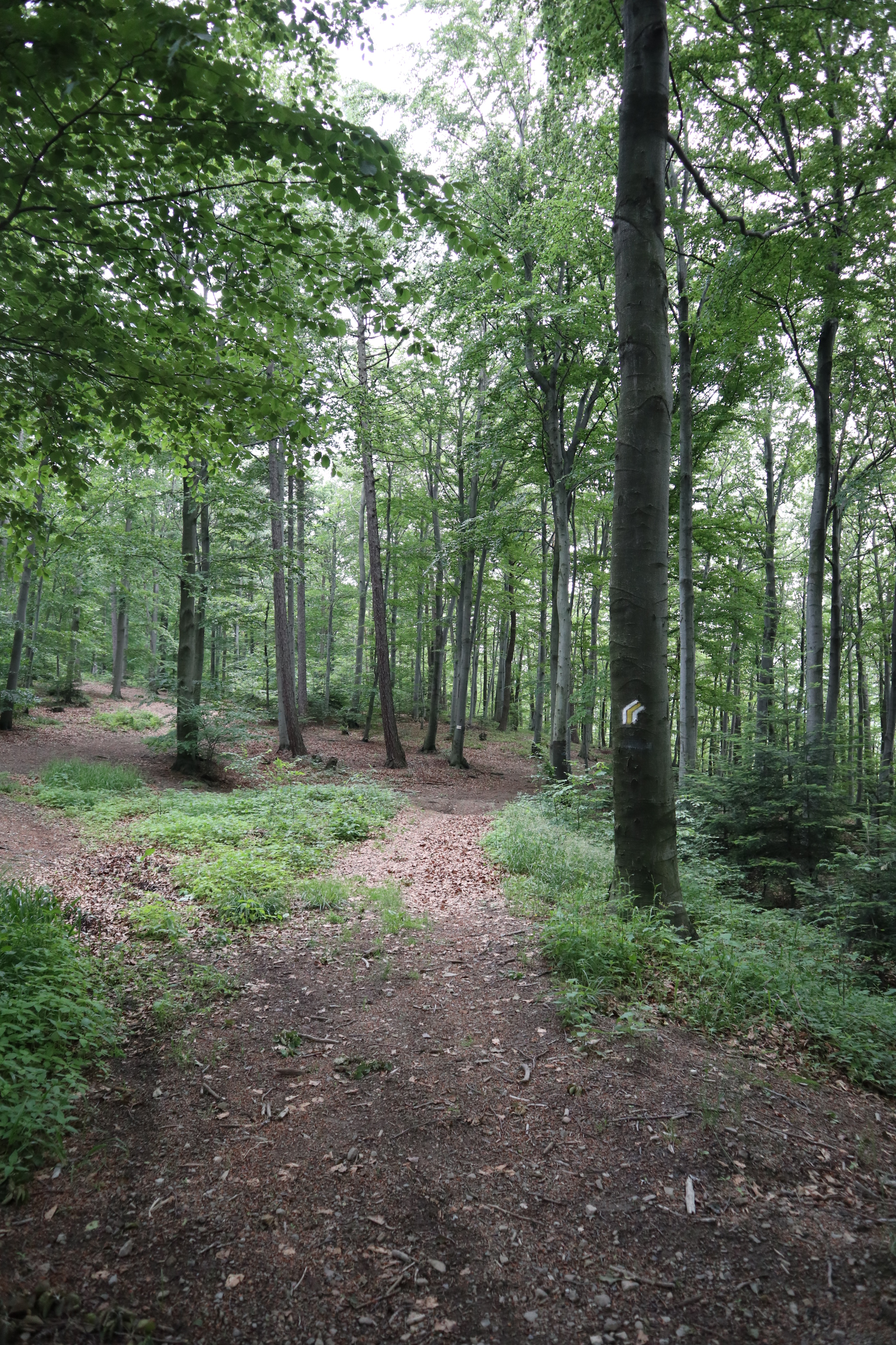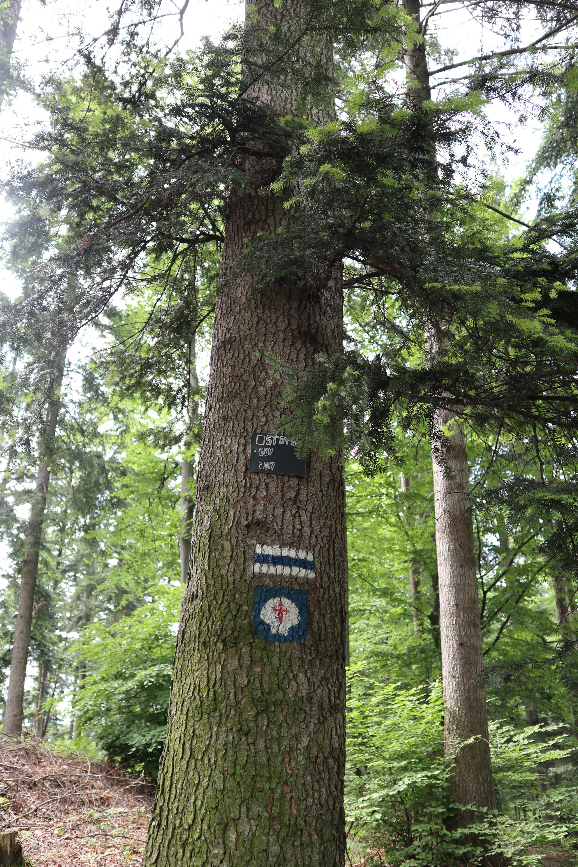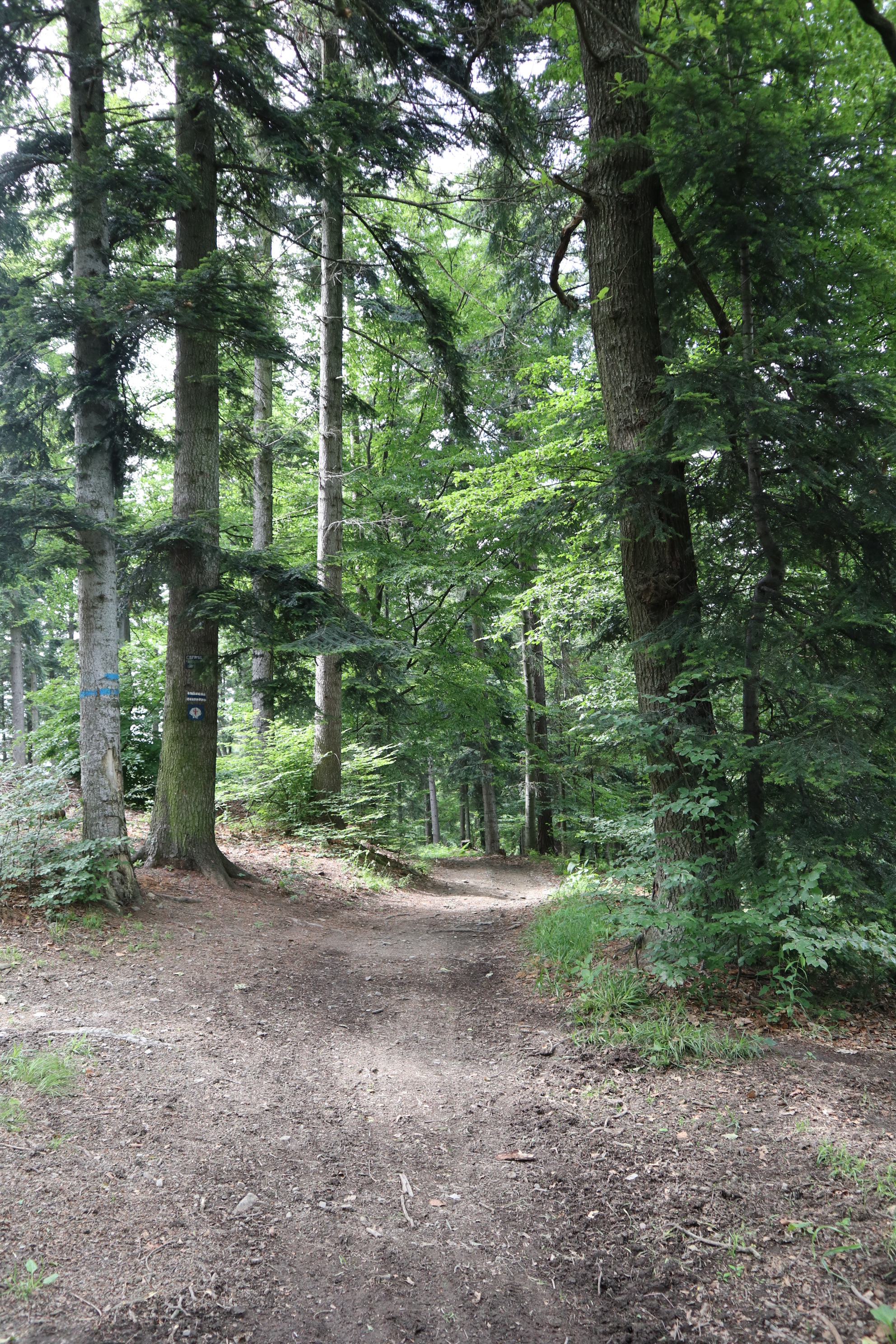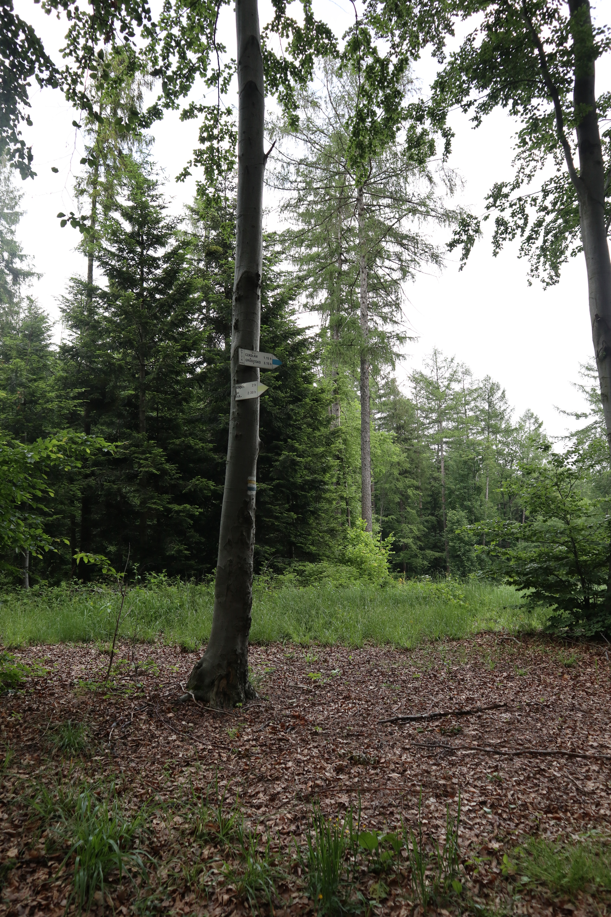 Spacer zaczynamy na Przełęczy Zasańskiej. Nie ma tutaj niestety żadnego dużego parkingu, ale pobocze i zjazd w osiedlową drogę jest na tyle duży, a zainteresowanie szlakiem na tyle małe, że spokojnie można zaparkować samochód. Nie jest to popularna trasa i tłumów na pewno nie trzeba się tutaj spodziewać. Pierwsze kilkaset metrów idziemy osiedlową drogą wzdłuż zabudowań w kierunku lasu żółtym szlakiem. Zanim wkroczymy do lasu, z przełęczy możemy podziwiać piękne widoki z Kamiennikiem na pierwszym planie. Po wejściu do lasu przez chwilę podchodzimy wąwozem. Wkrótce jednak dochodzimy na grzbiet, gdzie z prawej dochodzi droga (szlak niebieski w kierunku Glichowca). Wędrujemy jednak dalej za podwójnym oznakowaniem (żółtym i niebieskim), by potem odbić w lewo niebieskim szlakiem w kierunku Ostrysza (507 m n.p.m). Trasa jest na tyle łagodna i niewymagająca, że nawet 2-latek spokojnie pokona ją na własnych nogach. Od momentu minięcia Ostrysza ścieżka nieco opada w dół.