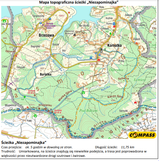 Tuż pod szczytem Trupielca znajduje się duży plac z miejscem na ognisko i odpoczynek. Stąd też można w prawo odbić na ścieżkę „Niezapominajka”. Jej długość to prawie 12 kilometrów. Poniżej zamieszczam Wam jej mapę, a tu link do pliku PDF, gdzie możecie się o niej więcej dowiedzieć.