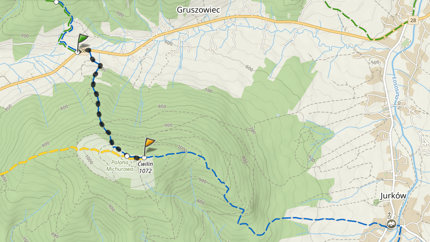 Wyprawa z Przełęczy Gruszowiec to najkrótsza opcja, którą tym razem wybraliśmy. To jednak najbardziej stromy sposób na zdobycie góry i zimą przydadzą się Wam na szlaku raczki. Jeśli nie lubicie ostrych podejść polecam Wam trasę z Jurkowa. Jest ciut dłuższa, ale bardziej malownicza i z zdecydowanie łagodniejszym podejściem. Opisałam ją już kiedyś we wpisie Ćwilin – beskidzka wyspa z bajecznym widokiem.