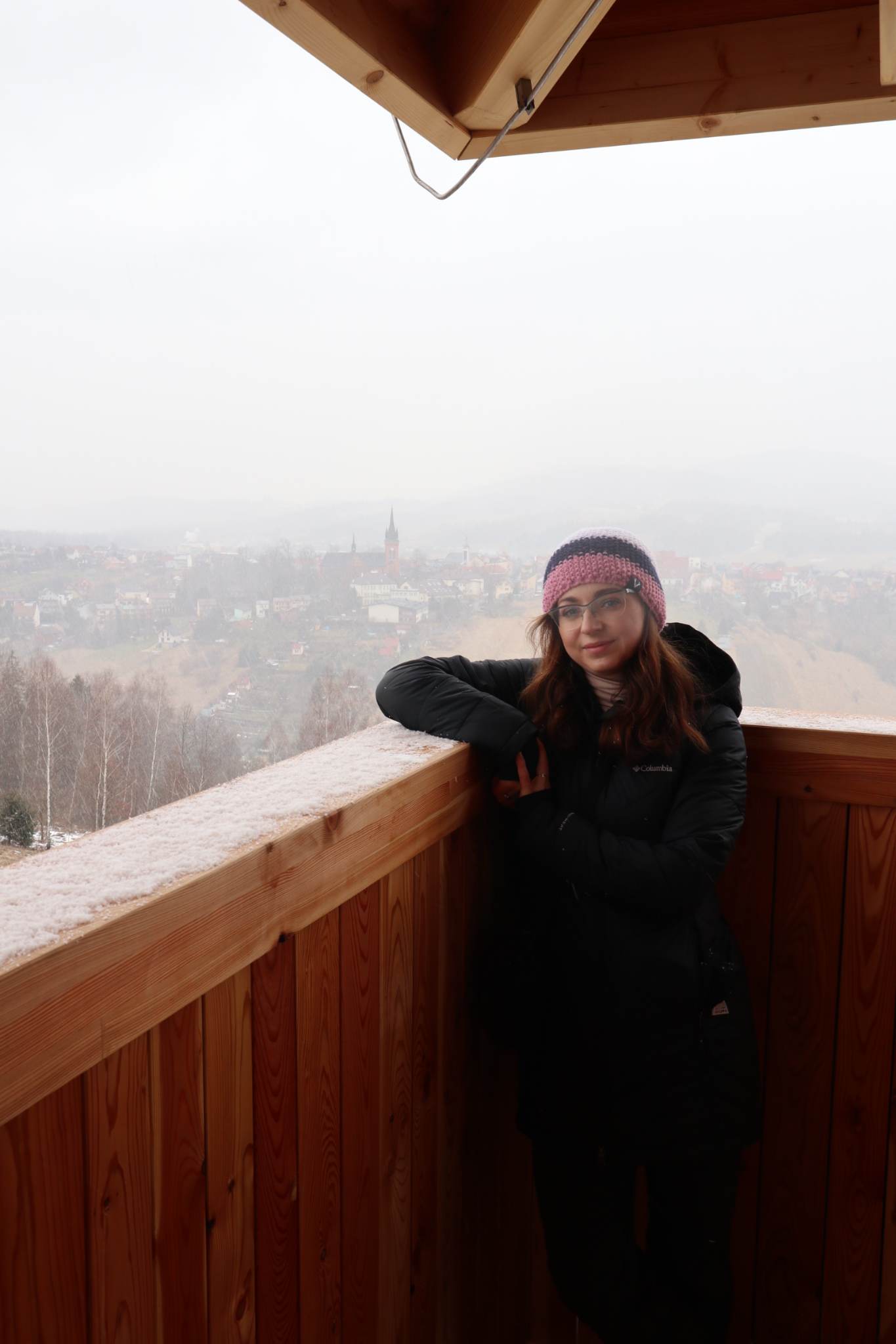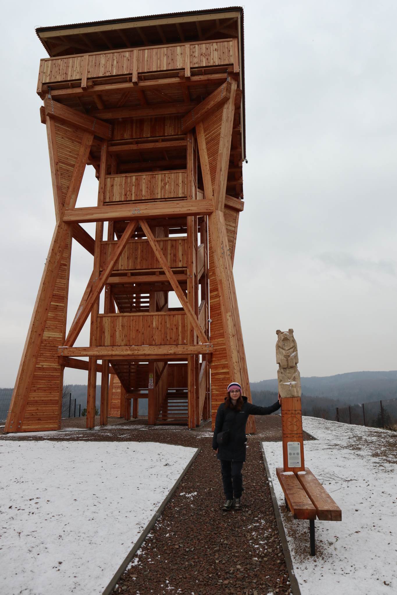 Wieża widokowa to licząca 18 metrów drewniana konstrukcja, wzniesiona została 534 metry n.p.m. na wzgórzu Hajdówka. Jest podświetlona, wyposażona w lunetę, mapy widokowe i system kamer. Niestety, gdy my tutaj byliśmy po raz pierwszy, to aura nam nie sprzyjała. Nic nie szkodzi, bo na pewno tutaj wrócimy, tym bardziej, że często jesteśmy w okolicy, a to idealne miejsce na krótki rodzinny spacer i piknik.