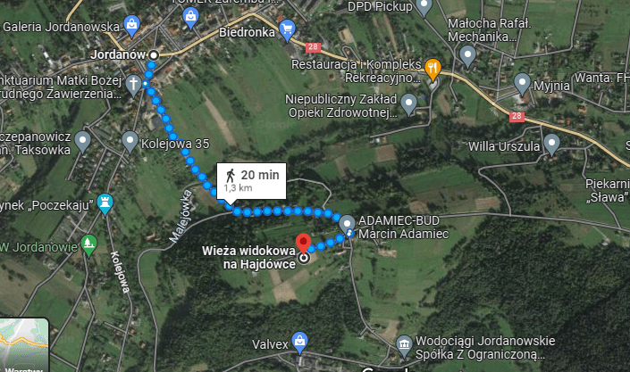 Z rynku kierujemy się ulicą Kolejową w kierunku kościoła i szkoły podstawowej. Obok tej drugiej skręcamy w lewo w ulicę Hajdówka (na początku tej uliczki jest pizzeria Gracja). Droga, choć momentami stroma, prowadzi utwardzoną, w większości asfaltową ścieżką, zatem jest dostępna również dla wózków. Na początku idzie się obok ogródków działkowych chodnikiem. Stąd doskonale widać cel wędrówki – wieżę widokową. Potem przechodzi się przez mostek nad rzeką Majejówka i dalej ulicą Hajdówka pnie się do góry asfaltem. Na górze ostatni fragment wiedzie szutrową drogą, ale i tutaj ewentualny wózek spokojnie da radę przejechać.