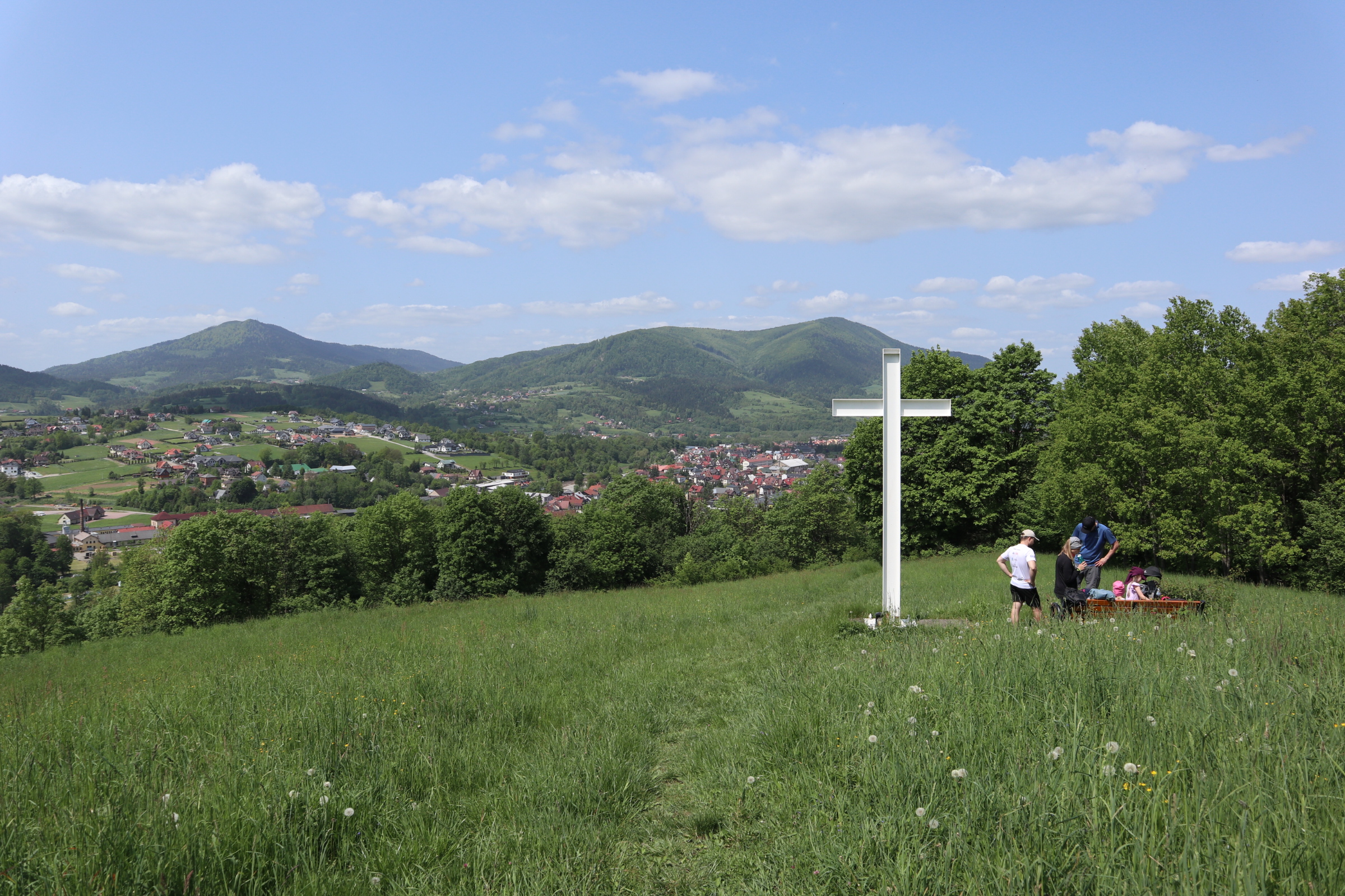 Wtedy też rozpocznie się ta urokliwsza część trasy. Będziecie mogli podziwiać miasteczko, otoczone beskidzkimi wyspami. Lubogoszcz, Szczebel i Luboń Wielki pięknie się stąd prezentują. Stamtąd jeszcze kilka lub kilkanaście minut, w zależności od tego czy idą z Wami dzieci, czy nie i znajdziecie się pod metalowym krzyżem, który stoi tutaj od 1990 roku. Tutaj panorama się poszerza i odsłania się prawdziwy urok Zagórzańskich Dziedzin – Beskid Wyspowy przechodzi płynnie w pasmo Gorców. Wszystko to możecie podziwiać siedząc wygodnie na ławce.