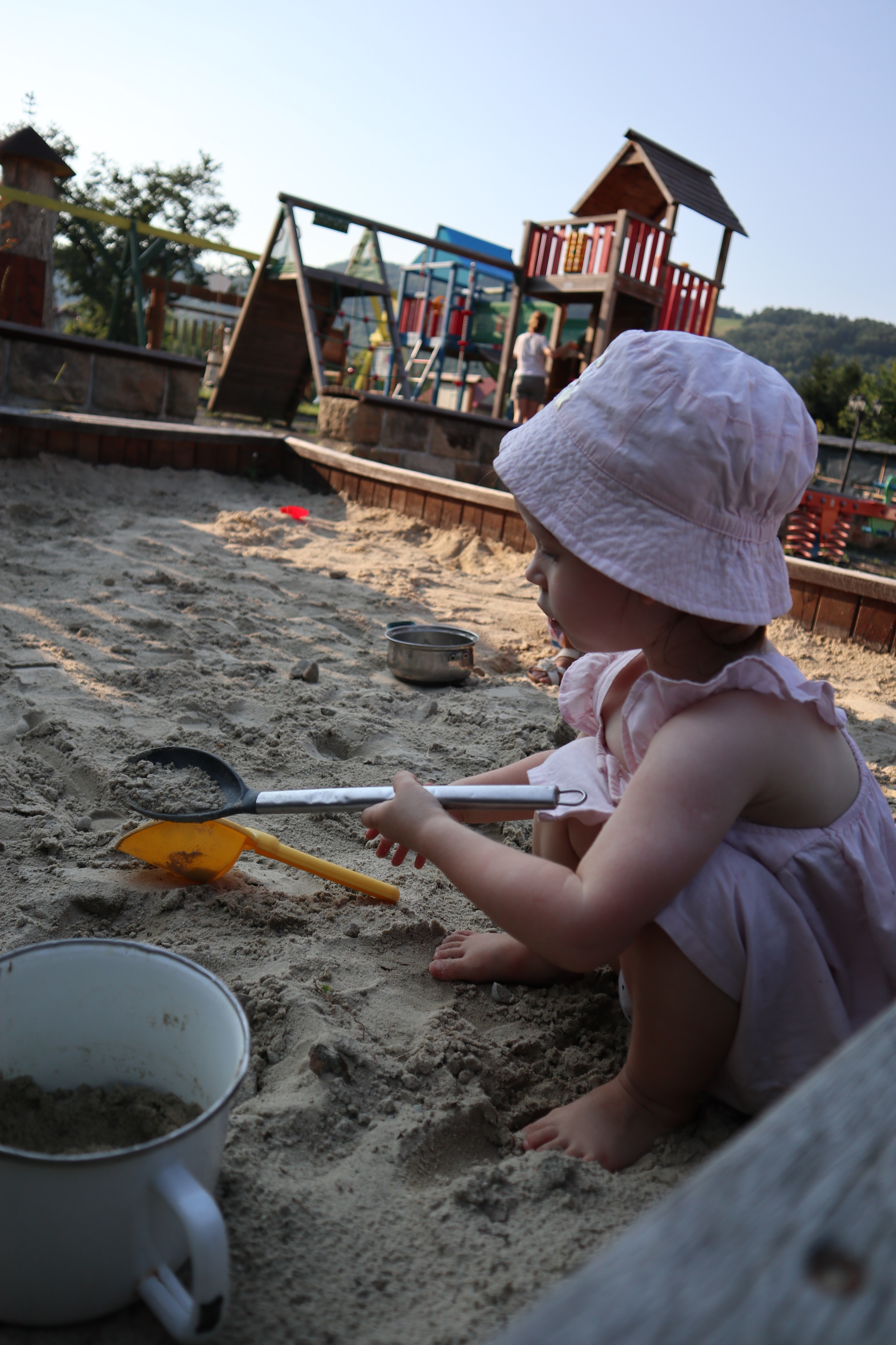 Od razu widać, że przyjeżdża tutaj sporo wycieczek szkolnych. To miejsce ma ogromny i bardzo ciekawy plac zabaw. Nie brakuje huśtawek, drabinek, domku, rewelacyjnej piaskownicy do skoków w dal, gdzie można przy okazji dowiedzieć się ile skacze jakie zwierzę, atrakcji typu: leśne cymbały, czy „zgaduj zgadula”. Obok ogromnej piaskownicy jest kuchnia błotna, a obok niej skrzynia pełna zabawek do piasku i kuchni właśnie. Plac zabaw ma bezpieczną nawierzchnię (nawet krawężniki są nią pokryte). Jedyna wada to to, że drzewa są tutaj jeszcze małe i w upalny dzień mało tutaj cienia.