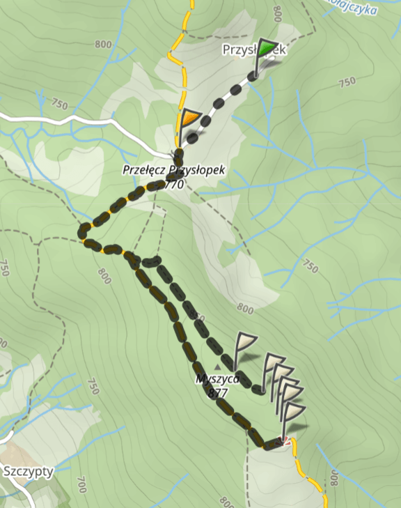 Zaraz za tą piękną ramką do zdjęć, możecie wejść do lasu i wydeptaną ścieżką dojdziecie (bez szlaku) do szczytu Myszycy, gdzie znajduje się tabliczka. Dalej ścieżką podążacie w kierunku Przełęczy Przysłopek (równolegle do żółtego szlaku) aż jak zaznaczyłam na powyższej mapie odbijecie lekko w lewo i wrócicie do szlaku. Powrót zajmie Wam mniej więcej tyle samo czasu.