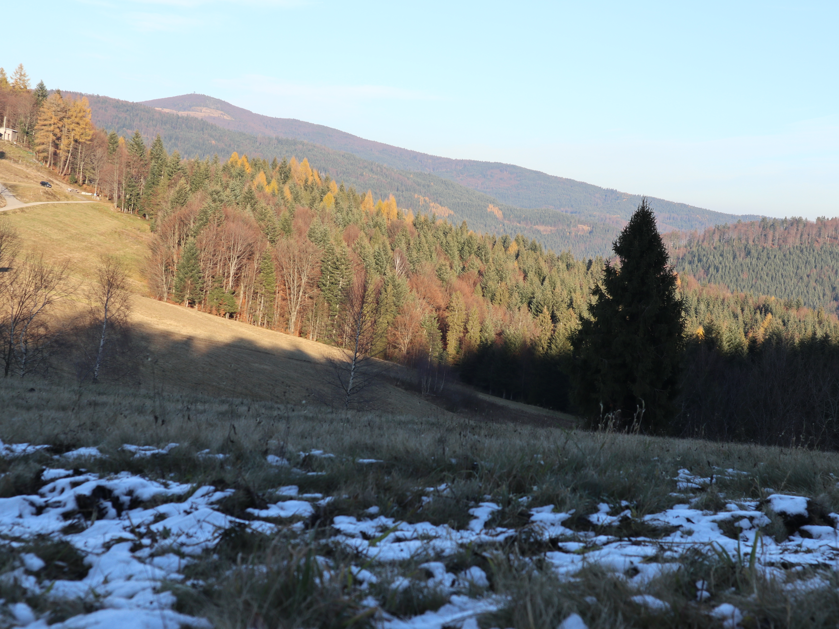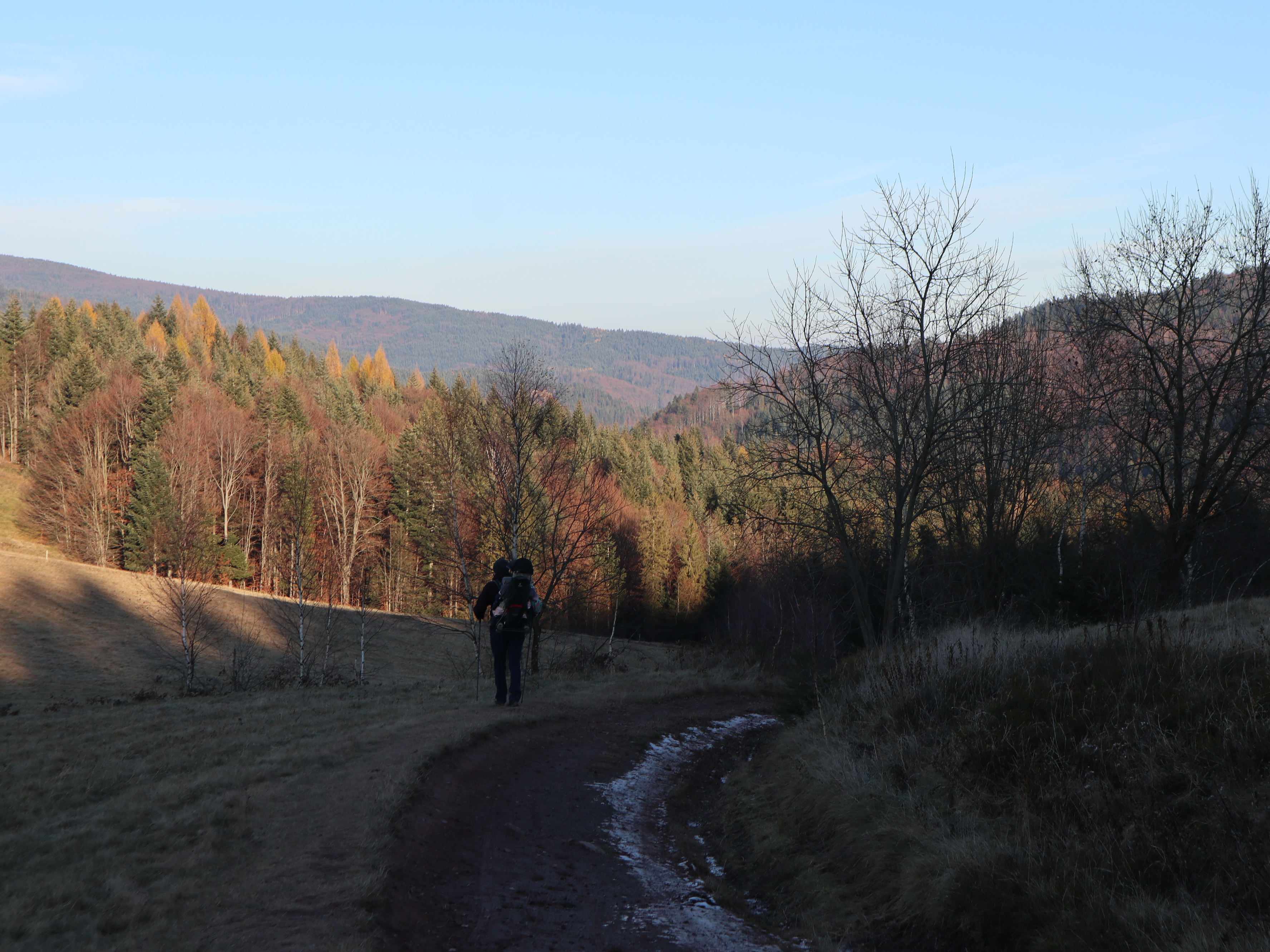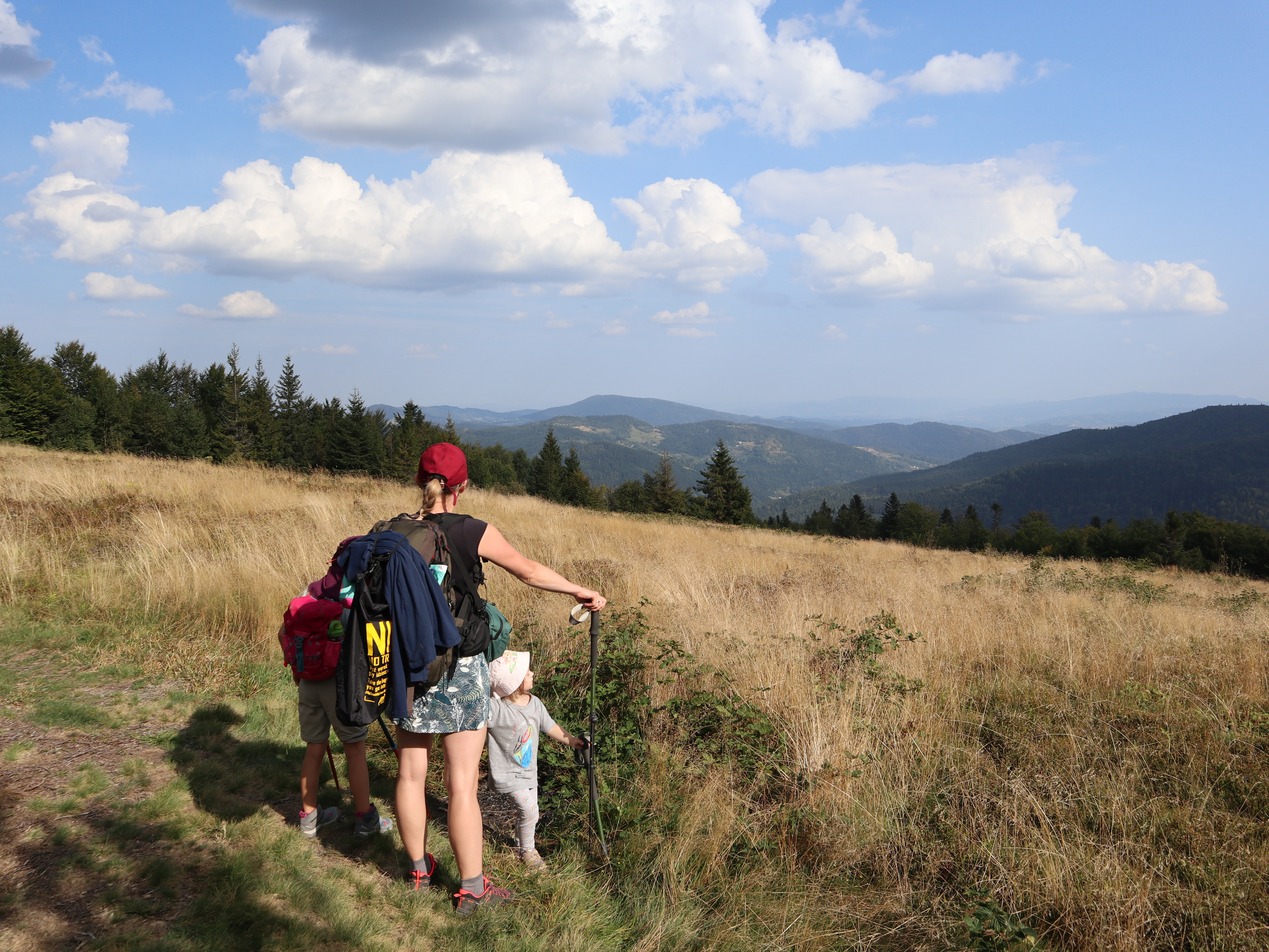 Druga opcja: na tę zdecydowaliśmy się tym razem to start z Przełęczy Przysłopek i kierowanie się żółtym szlakiem w stronę Lubomierza. Szlak jest bardzo przyjemny. Nie ma tu bardzo stromych podejść, jest piękny las i trasa idealna na lekką wędrówkę, ale i na wycieczkę z dziećmi. Już na starcie mamy piękny widok. Tutaj zaznaczę od razu, że mapy pookazują parking na przełęczy, ale w tym miejscu jest tabliczka z napisem teren prywatny, zakaz parkowania. Kilkadziesiąt metrów dalej jest malutki prywatny parking za 10 zł/cały dzień. Opłatę zostawia się w wyznaczonym pojemniku. Na tę opcję się zdecydowaliśmy, bo z zasady nie niszczymy prywatnych trawników.