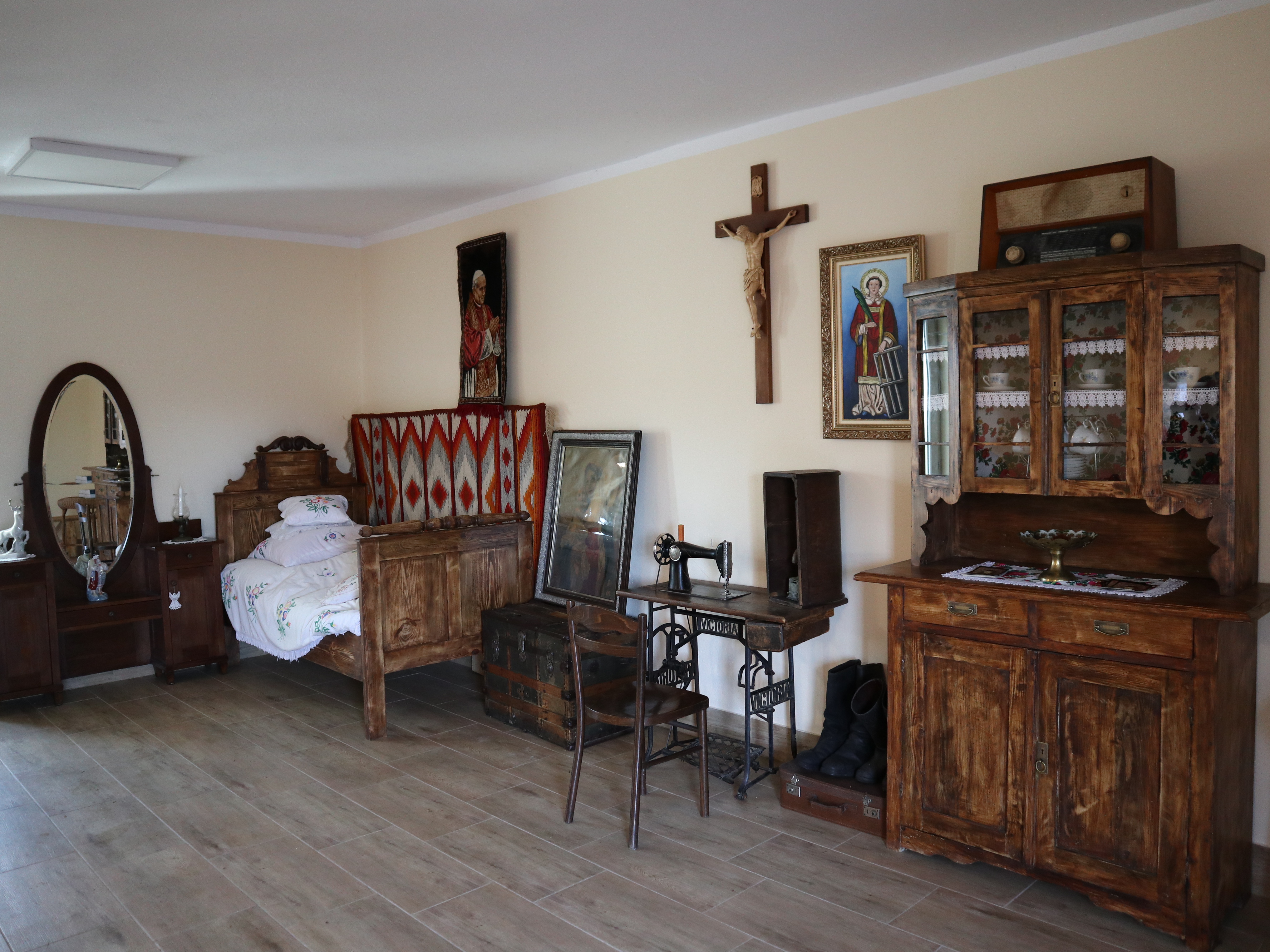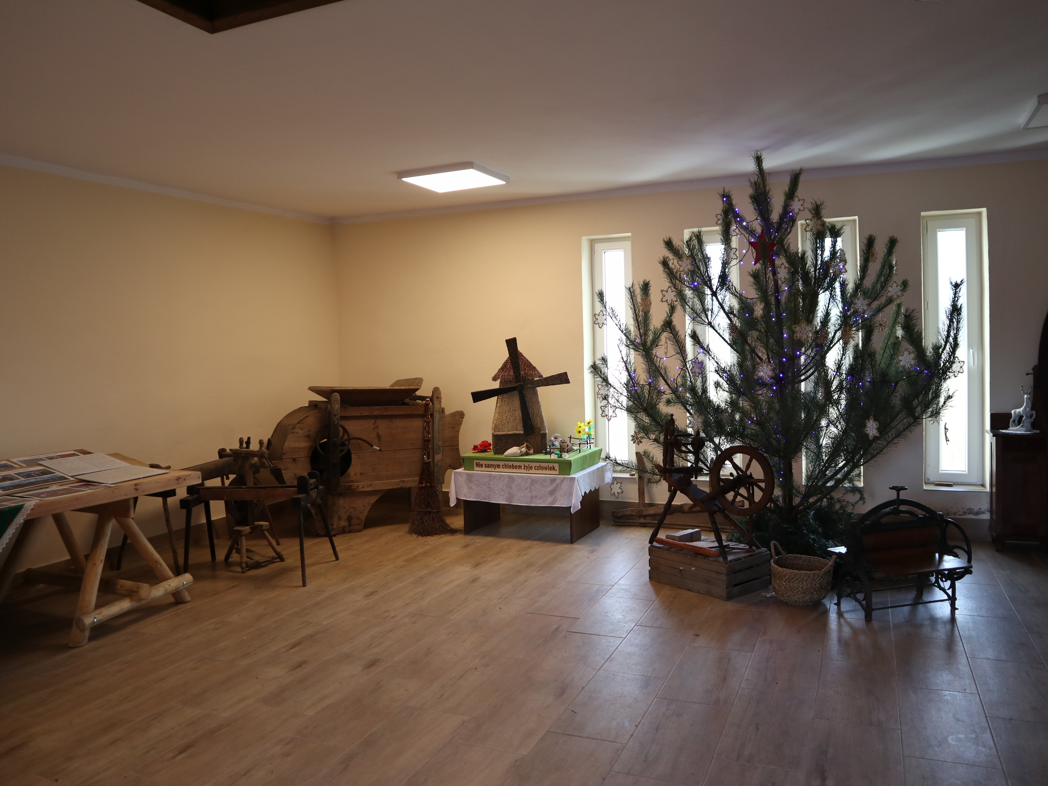 W wiosce, jest też pomieszczenie, w której możecie poznać kilka tradycyjnych regionalnych mebli(odwzorowano fragment izby), przedmiotów, zobaczyć galerię zdjęć z ważnych wydarzeń parafii.