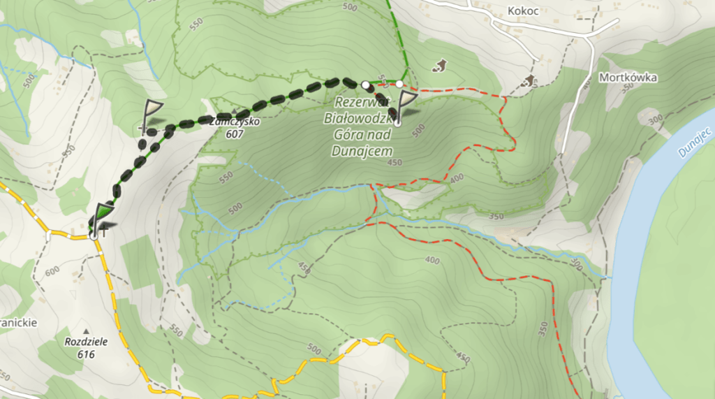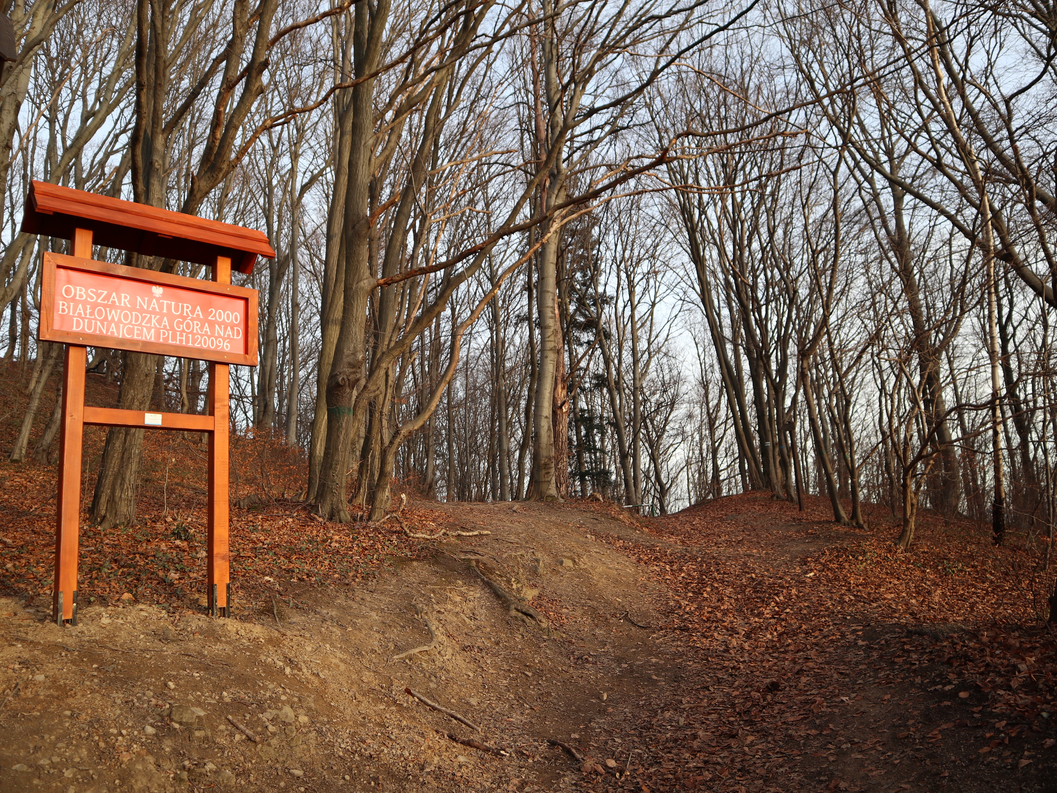 Z tego miejsca kierujemy się zielonym szlakiem w kierunku platformy widokowej. Dojedziecie tam w ok. 25 min, cały czas podziwiając fantastyczne krajobrazy. Od momentu wkroczenia do Rezewatu Białowodzka Góra nad Dunajcem zaczyna się las. (Rezerwat zajmuje powierzchnię 67,69 ha). Tutaj też są drewniane kierunkowskazy na platformę widokową. Pierwszy na wysokości Zamczyska. To jedna z dwóch kulminacji Białowodzkiej Góry ( liczy 607 m n.p.m.). Do platformy będziecie teraz schodzić w dół. Usytuowano ją na stromym zboczu.
