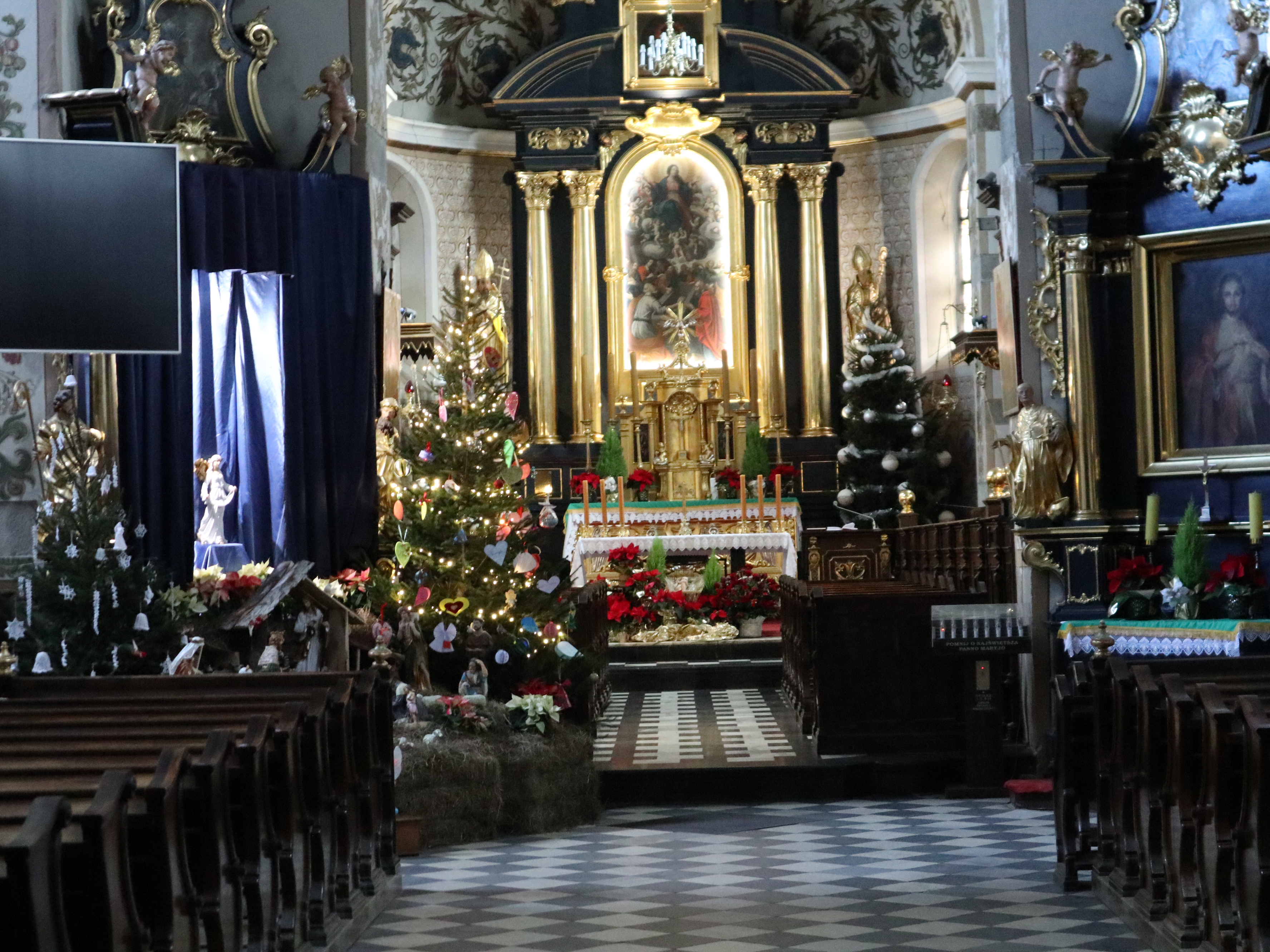 W centralnej części, po przeciwnej stronie od wejścia, jest piękna figuralna szopka z Jezusem, Maryją i Józefem. Są też Trzej Królowie i pastuszkowie.