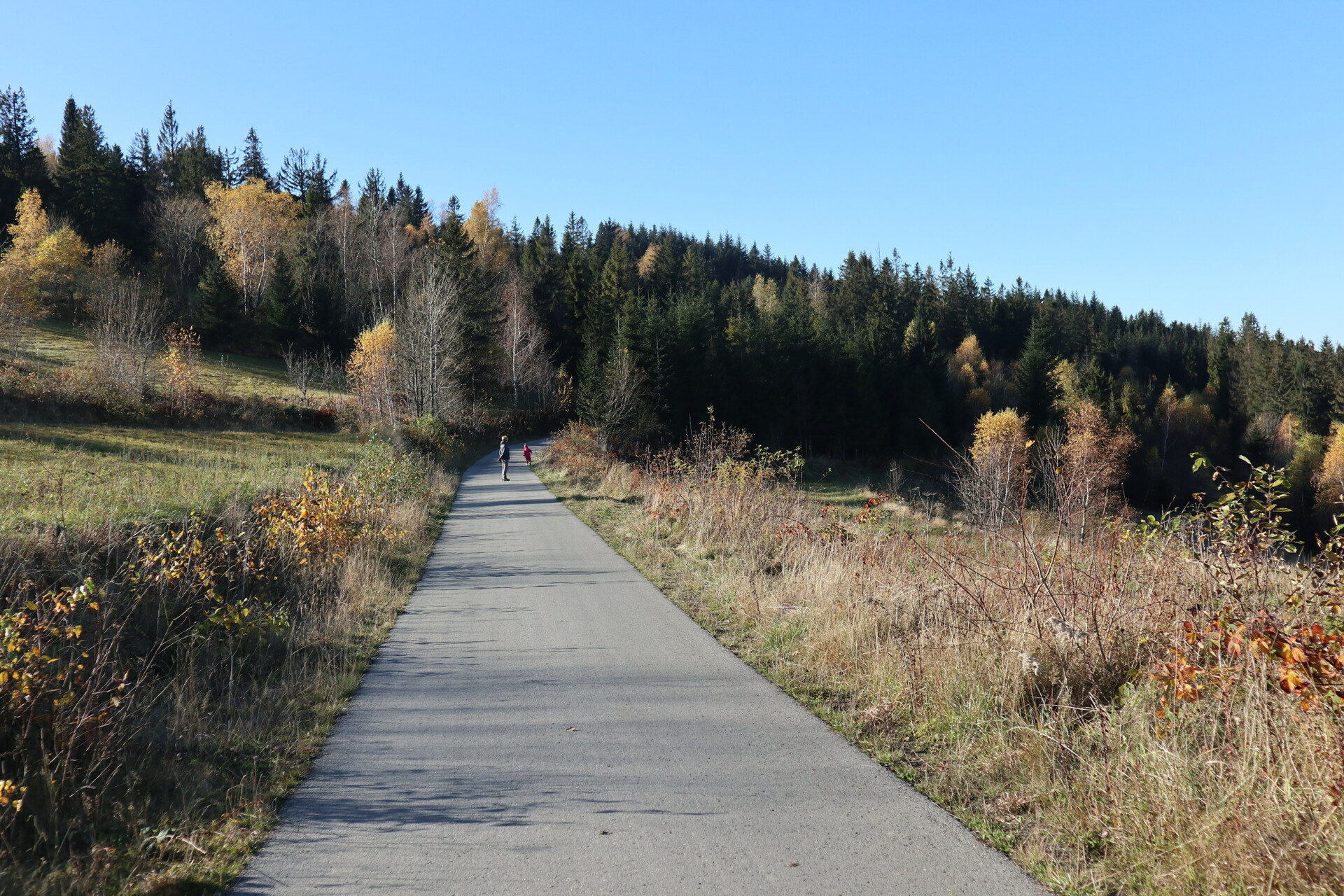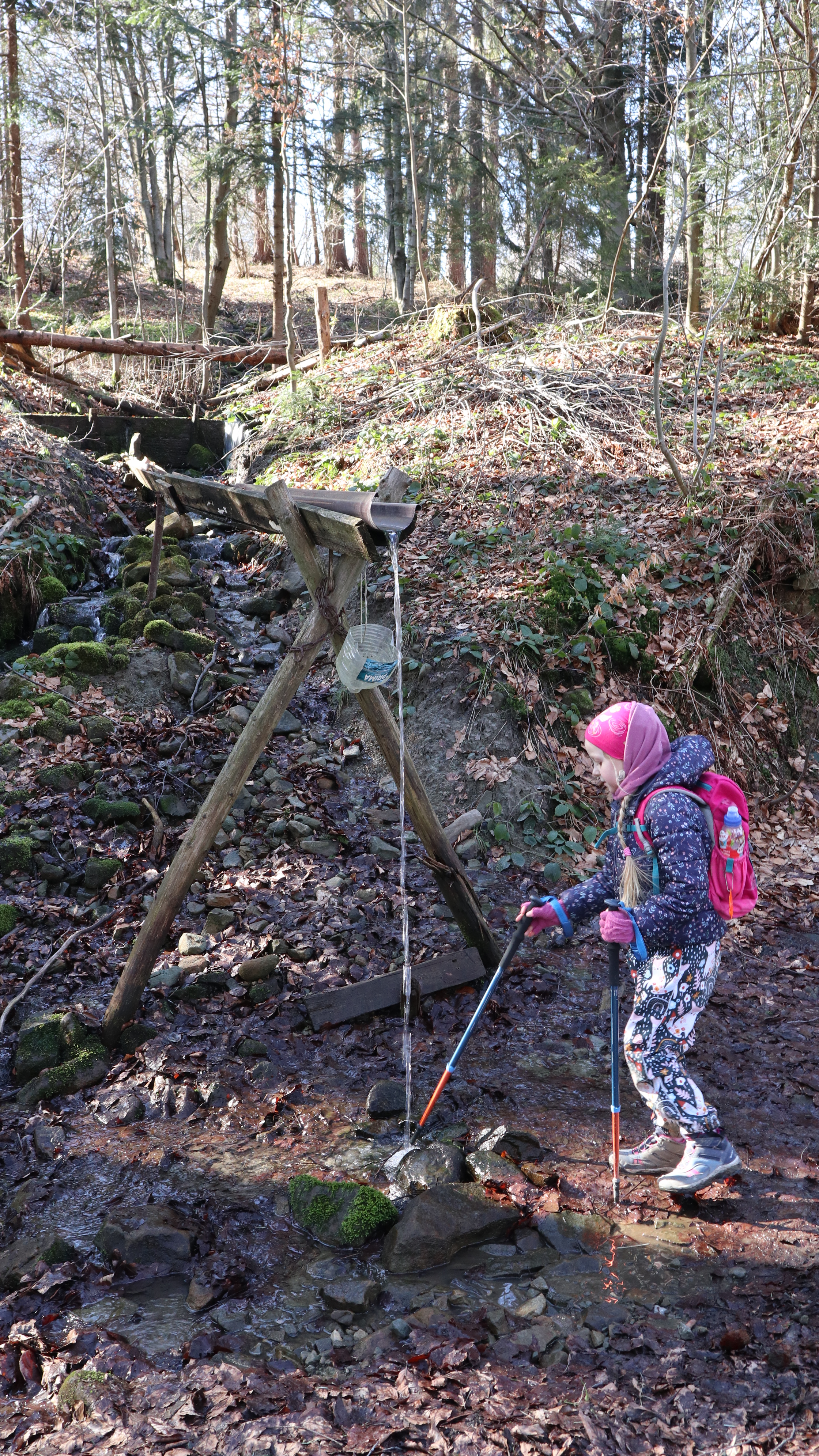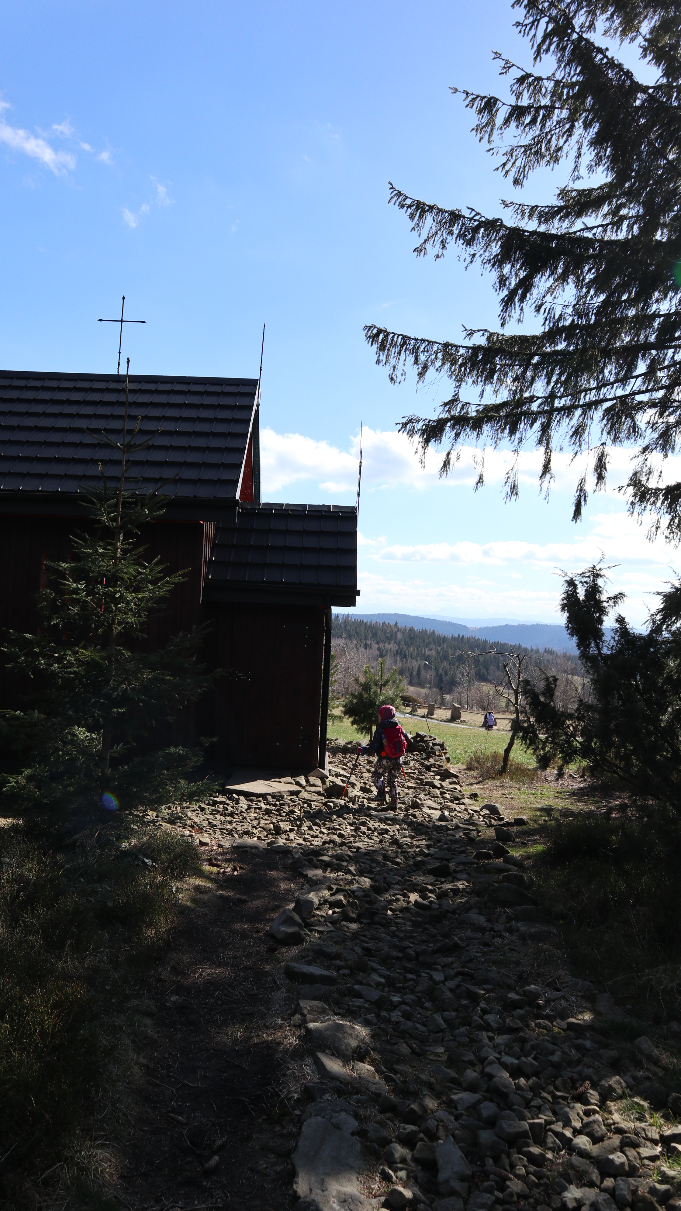 Potem już niebieskim szlakiem i kolejno czarnym schodzimy do centrum wsi. Ostrzegam: ten ostatni fragment czarnym szlakiem jest stromy, ale nie jakiś kamienisty. Dzieci tez sobie z nim poradzą.