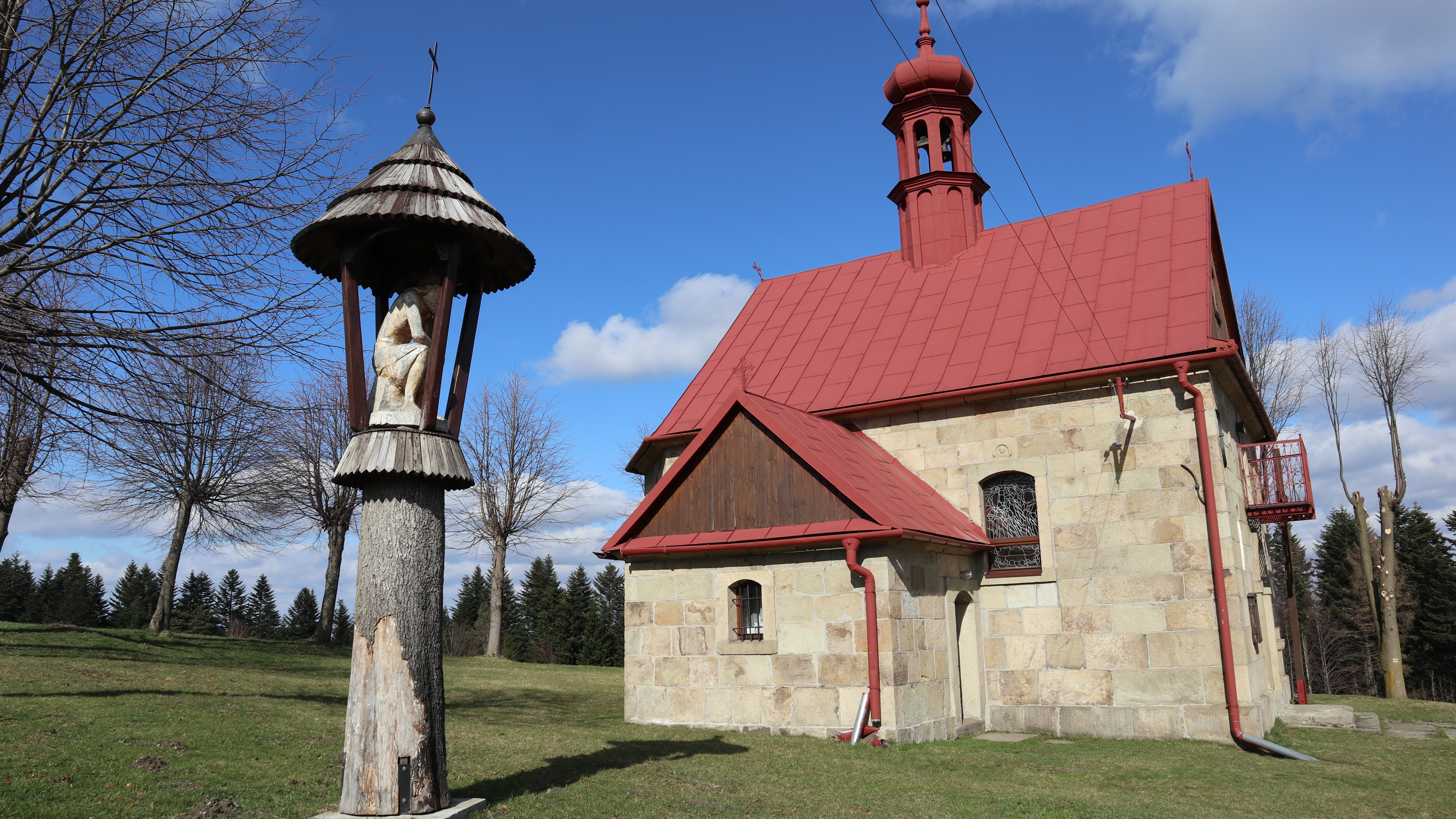 Od razu też dodam, że odcinek między Parszywką a Koskową Górą to lekki spacer, praktycznie bez wielkich przewyższeń. Dlatego tak wiele osób, szczególnie w weekendy wyjeżdża tutaj i wędruje tylko po grzbiecie. Łatwo się zachwycić krajobrazem i widokami na wszystkie strony świata, bo grzbiet szczytu pokrywają w głównej mierze pola i łąki, a lasy pojawiają się tutaj tylko fragmentarycznie. Największe zalesienie jest a odcinku Parszywka – kaplica Trzeciego upadku na Łazach. Najlepsze krajobrazy na odcinku kaplica na Łazach – szczyt Koskowej Góry. Sama kapliczka to miejsce najbardziej charakterystyczne na tej górze. Z jej powstaniem wiąże się niesamowita legenda: Beskidzkie legendy: niezwykła historia małej kapliczki na Koskowej Górze . Zachęcam Was do jej przeczytania lub odsłuchania.