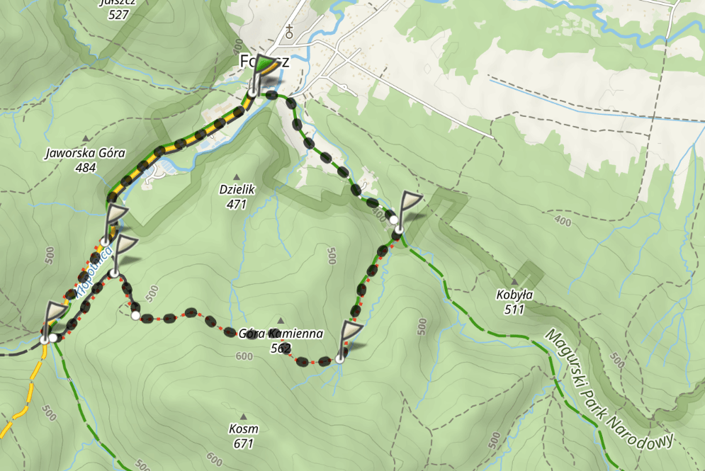 Stąd do punktu startowego schodzi się już w dół. Na końcu (początku, jeśli ktoś wybiera opisaną wyżej pierwszą opcję) jest miejsce wypoczynku. Dalej do Folusza idzie się już asfaltem.