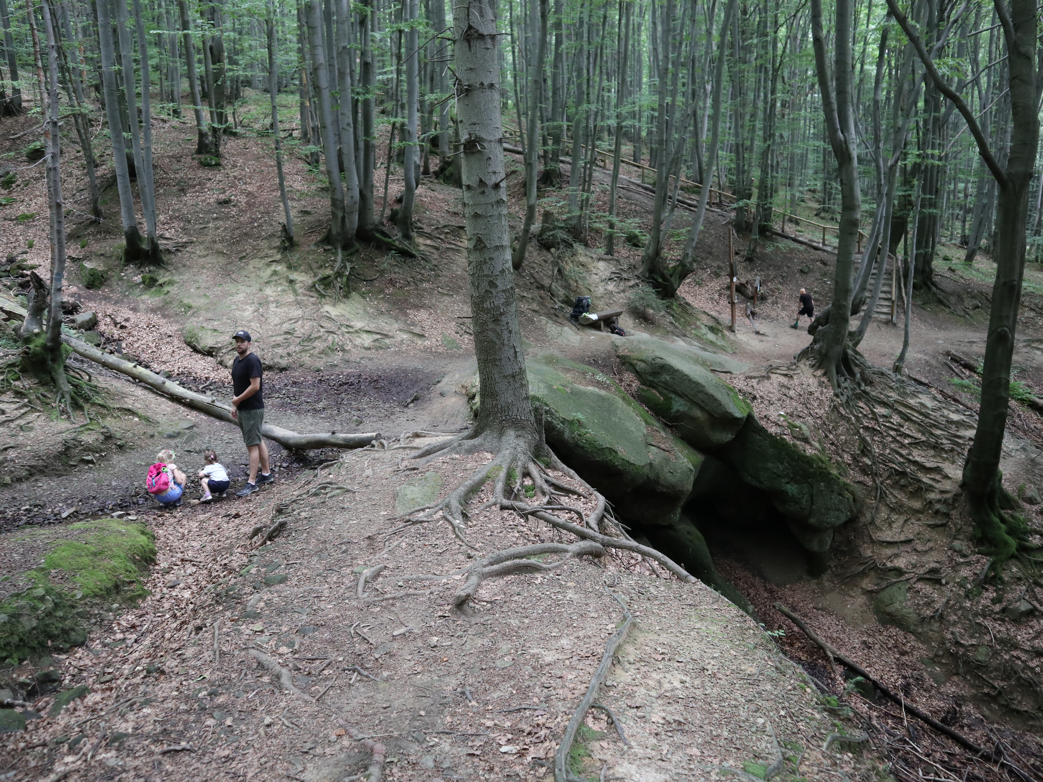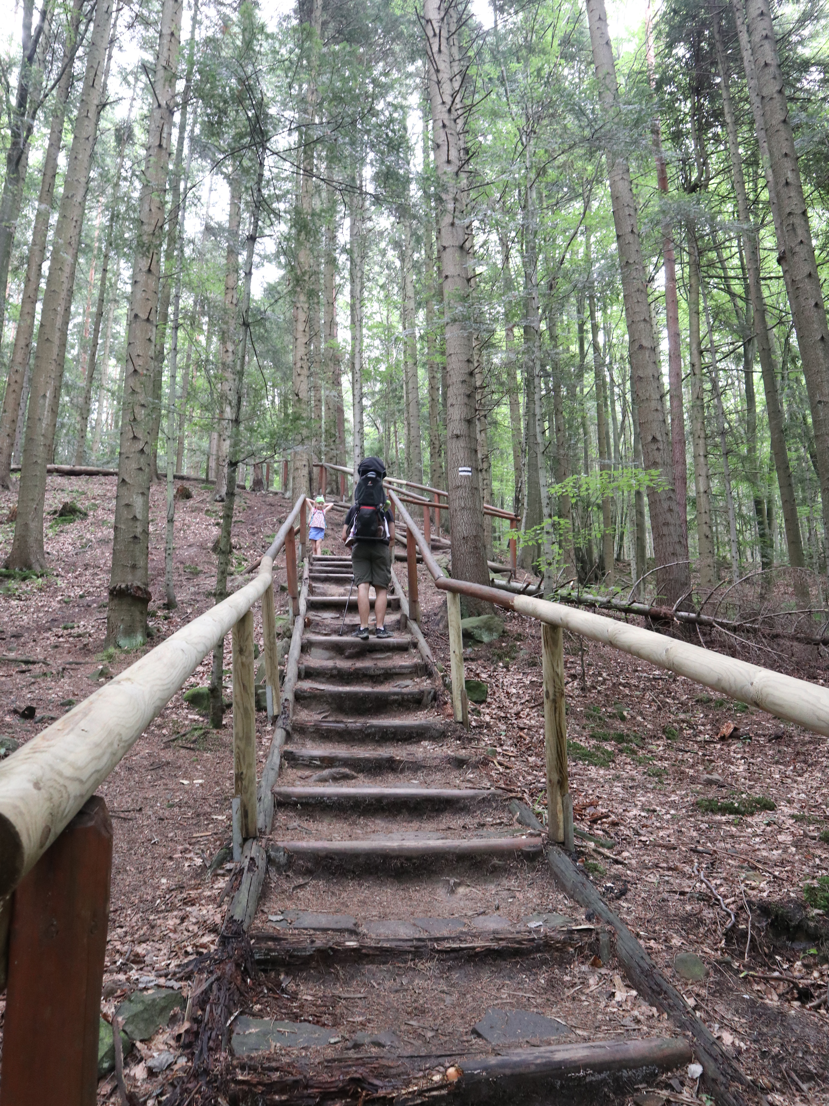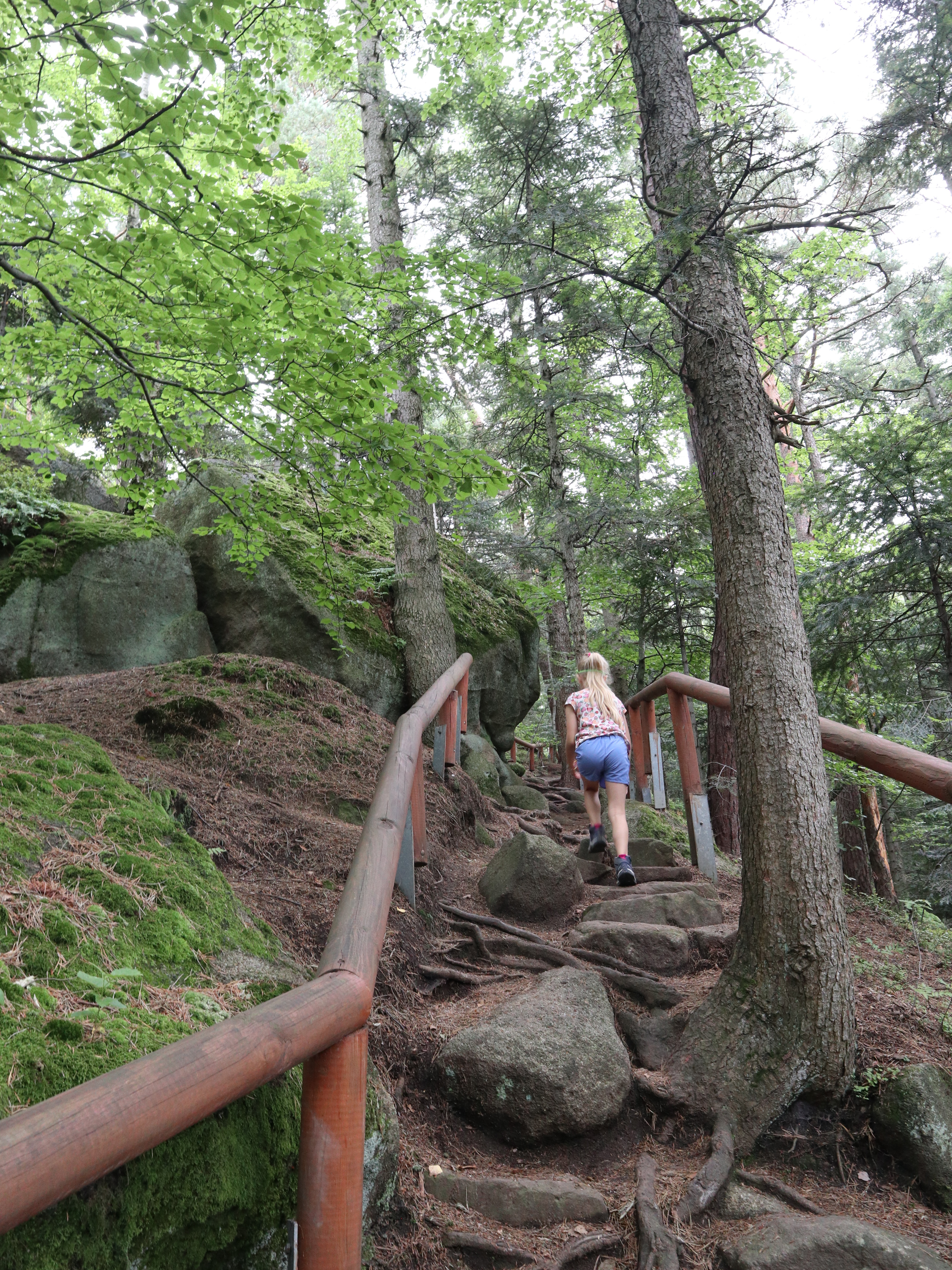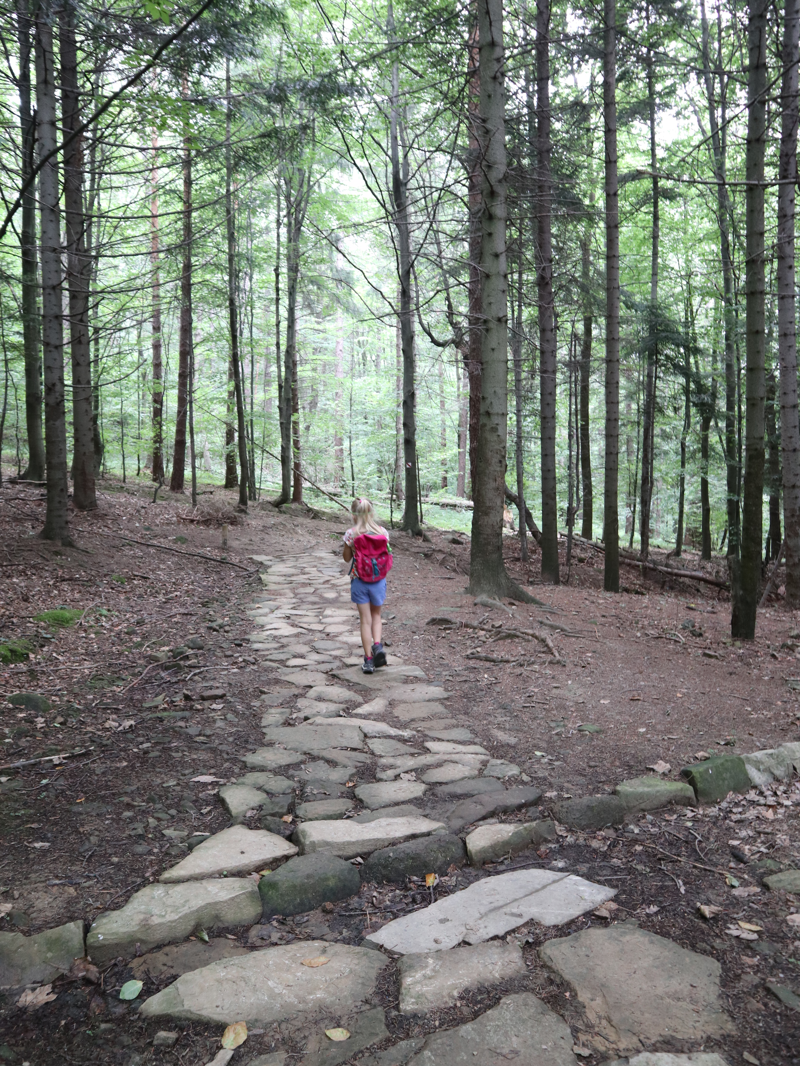 Pierwsze ok. 25 minut szliśmy asfaltem potem odbiliśmy na ścieżkę przyrodniczą i kierowaliśmy się w stronę Diablego Kamienia. Ścieżka jest dobrze oznaczona, nie brakuje barierek przy wyznaczonych ścieżkach. Korzenie drzew, czy kamienie tworzą niejednokrotne stopnie, które urozmaicają śceżkę i są świetnym wyzwaniem dla dzieci.