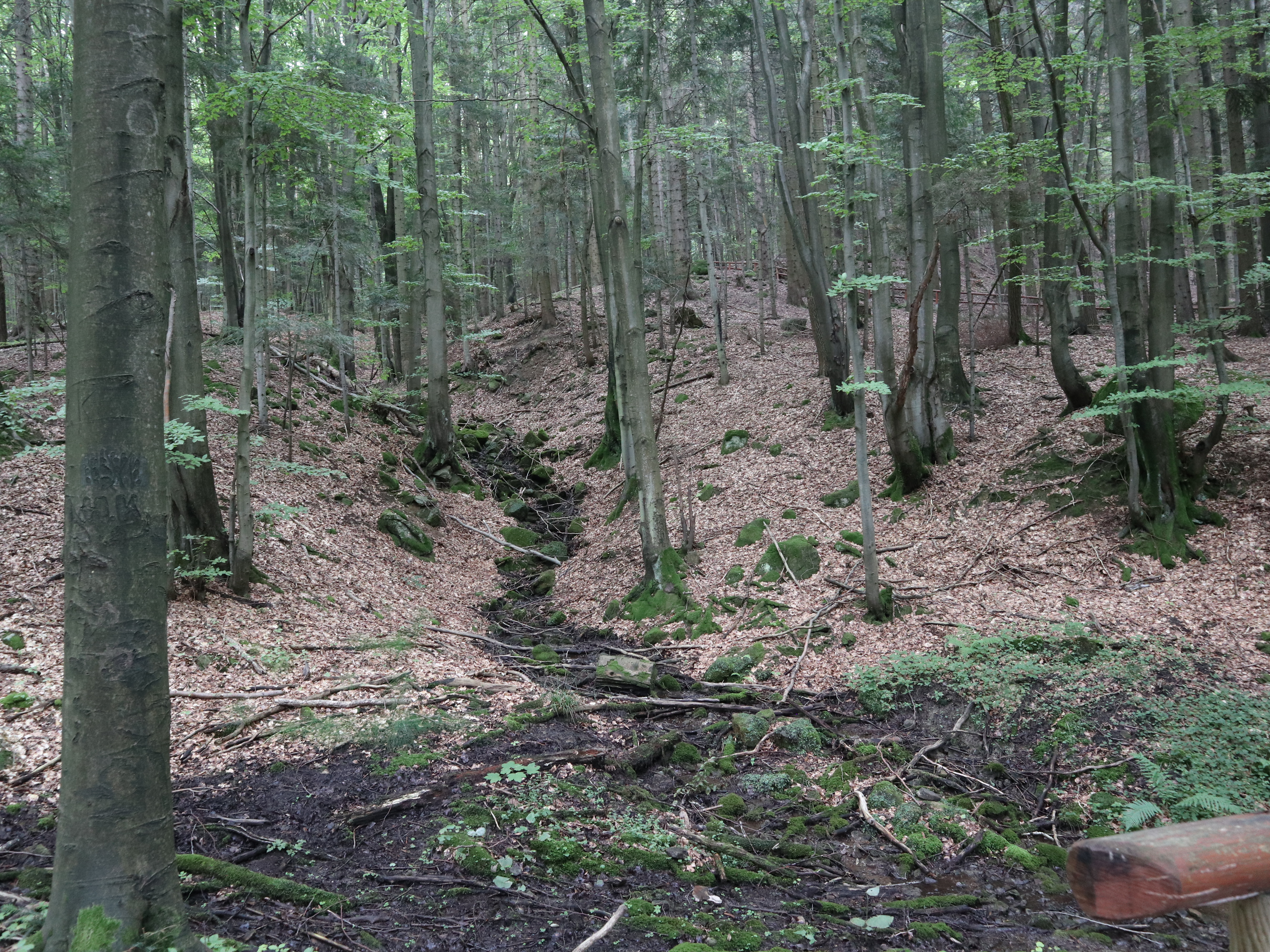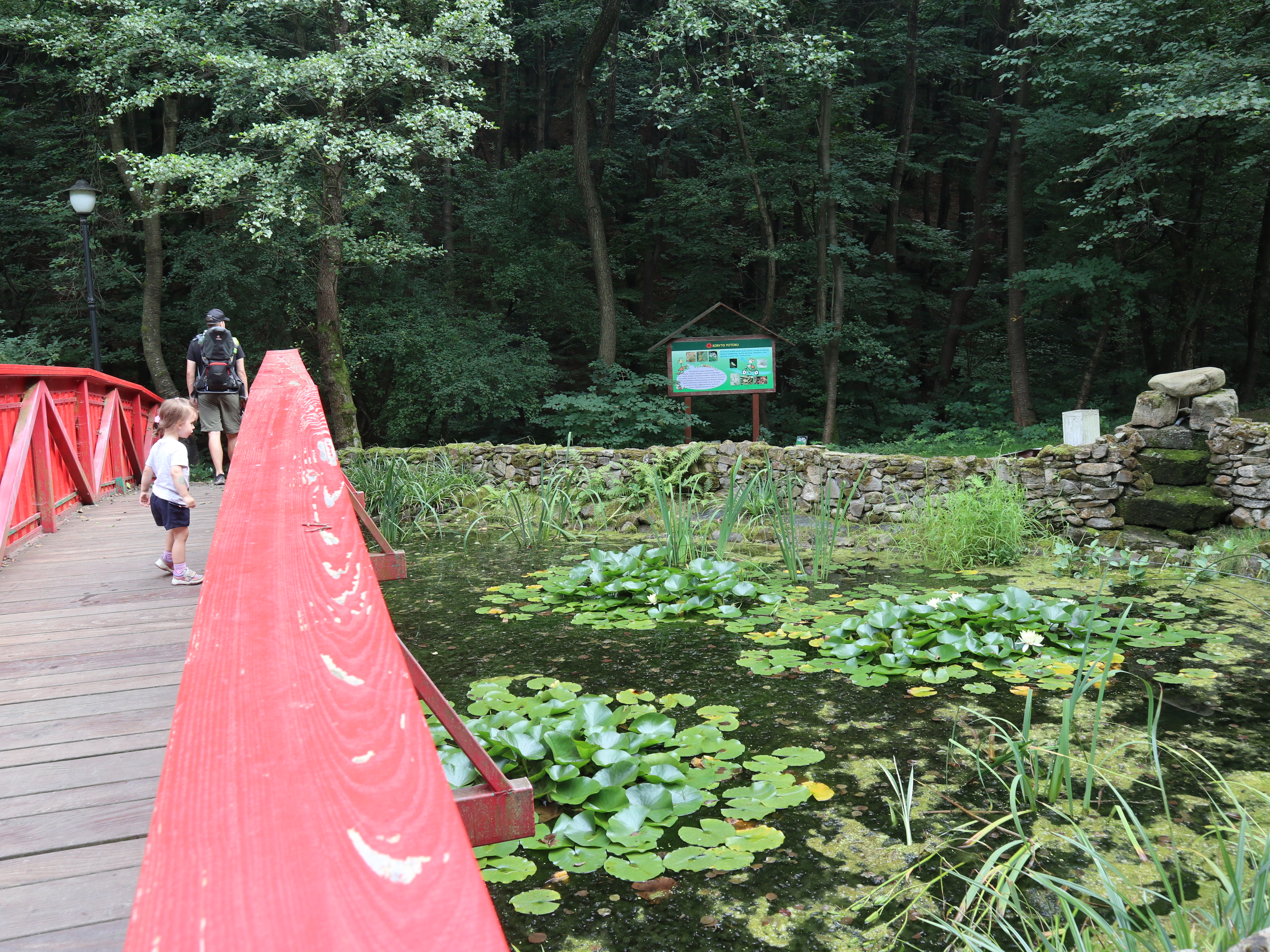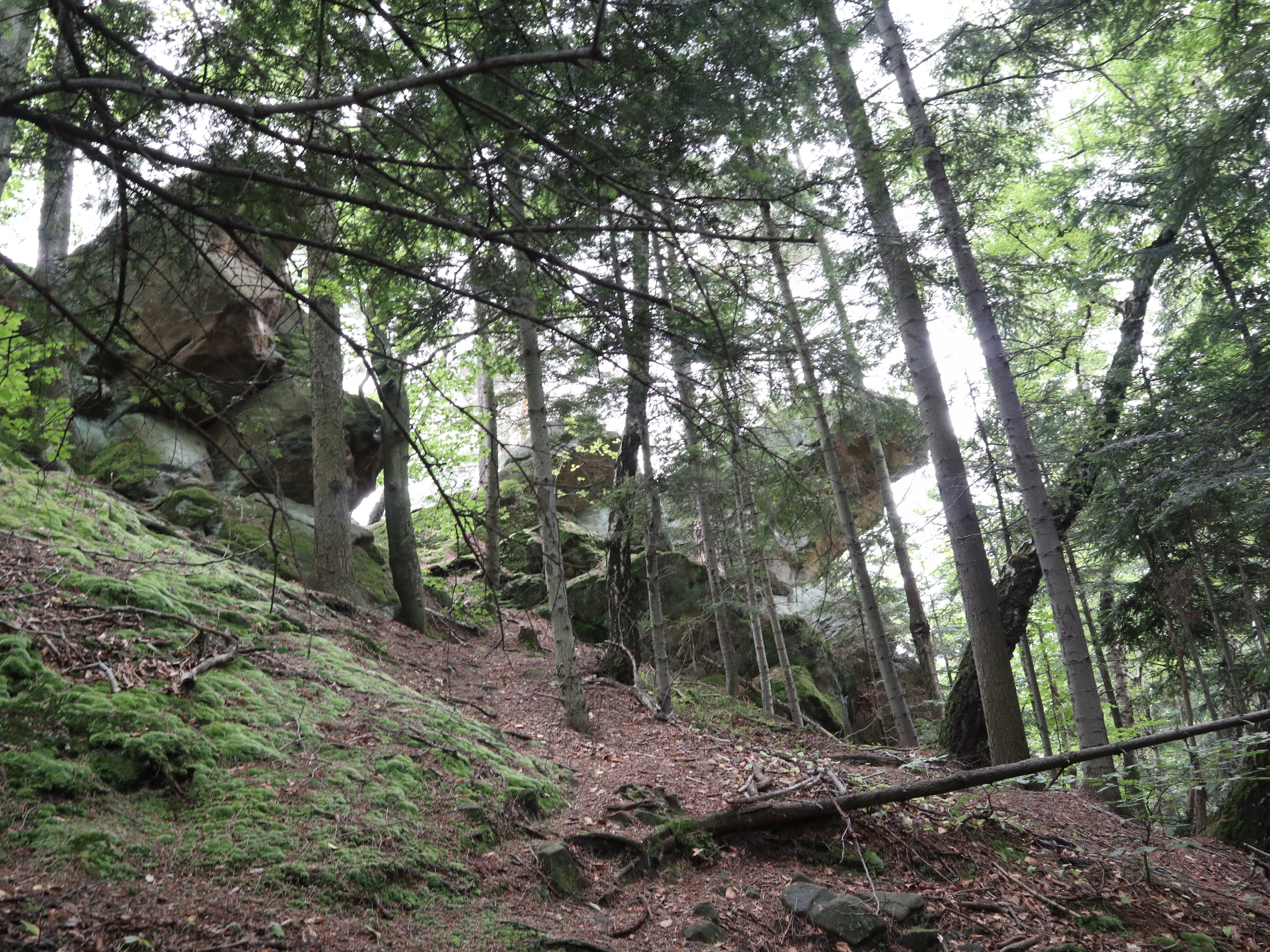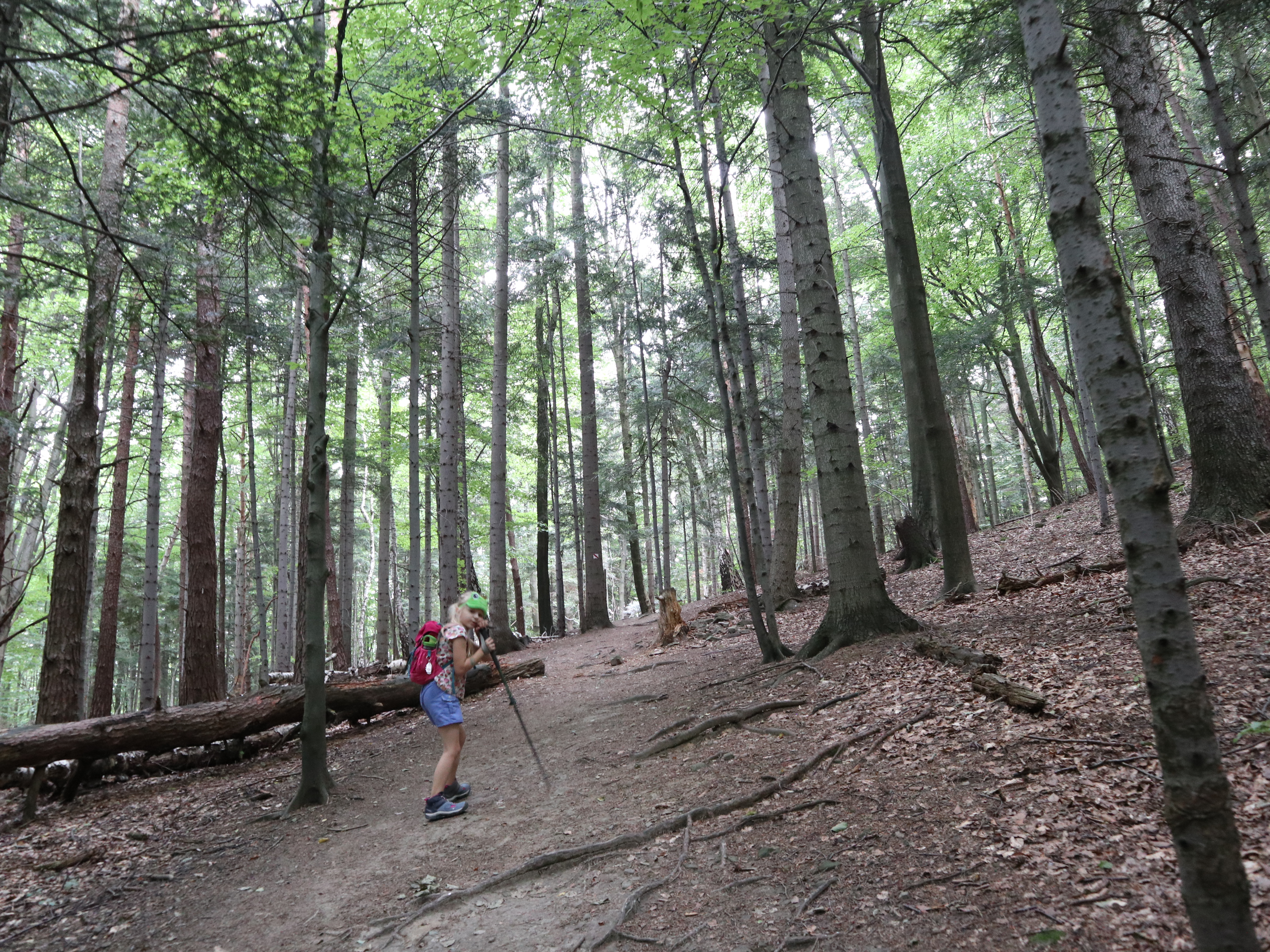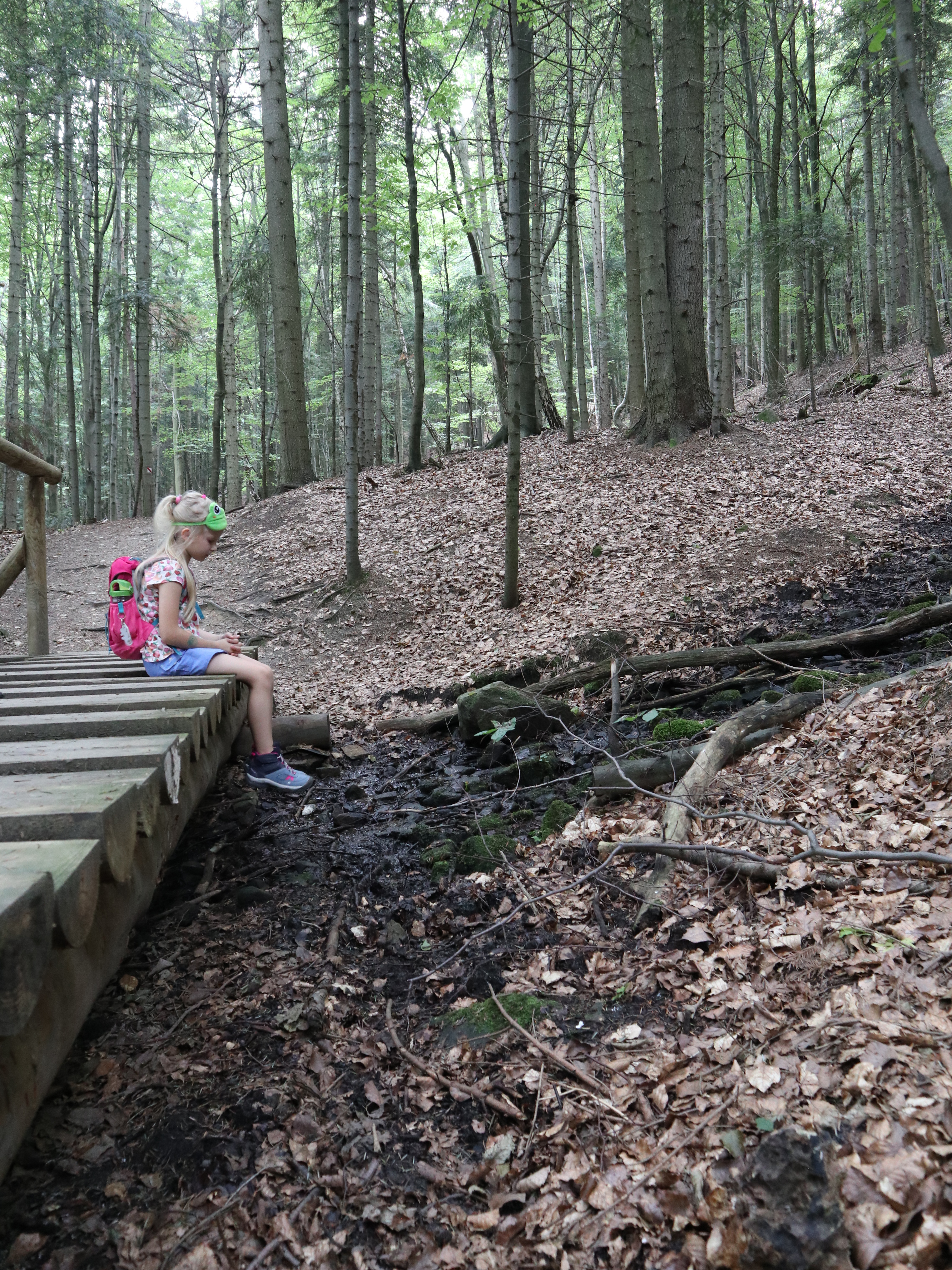 Pierwsze ok. 25 minut szliśmy asfaltem potem odbiliśmy na ścieżkę przyrodniczą i kierowaliśmy się w stronę Diablego Kamienia. Ścieżka jest dobrze oznaczona, nie brakuje barierek przy wyznaczonych ścieżkach. Korzenie drzew, czy kamienie tworzą niejednokrotne stopnie, które urozmaicają śceżkę i są świetnym wyzwaniem dla dzieci.