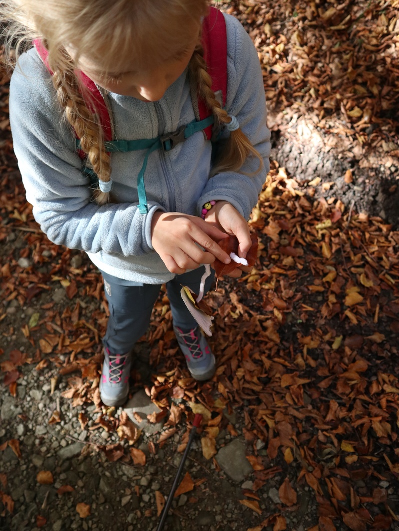 Po drodze dzieci z zachwytem zbierały kolorowe liście i układały z nich leśne gąsienice – coś jak te tutaj, tworząc przy tym prawdziwe dzieła sztuki prosto z natury. Jesienią aż kusi, żeby zrobić z liści gąsienicę, liska, sówkę czy całe zwierzęce zoo – wystarczy trochę wyobraźni. Starsze dzieci mogą się bawić w rozpoznawanie gatunków drzew i zbierać „kolekcje” liści do późniejszego wklejenia do zielnika.