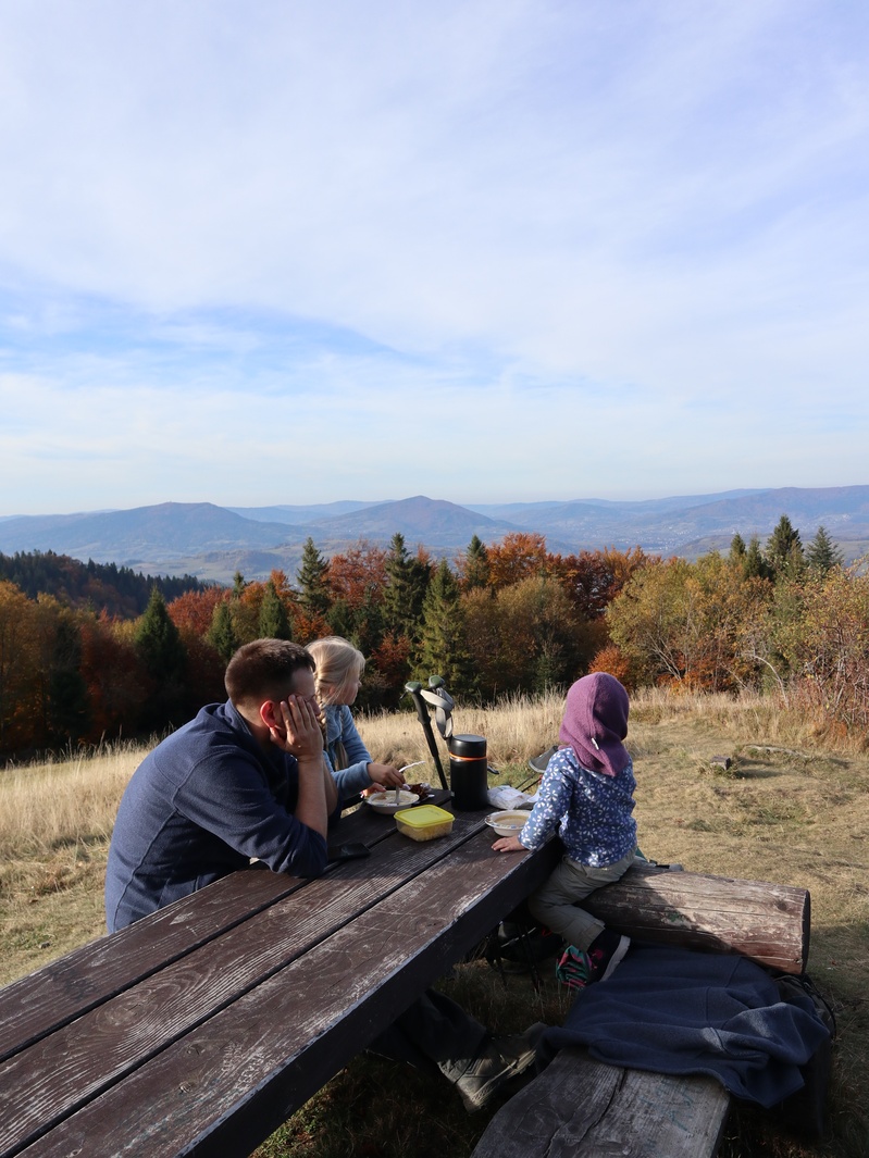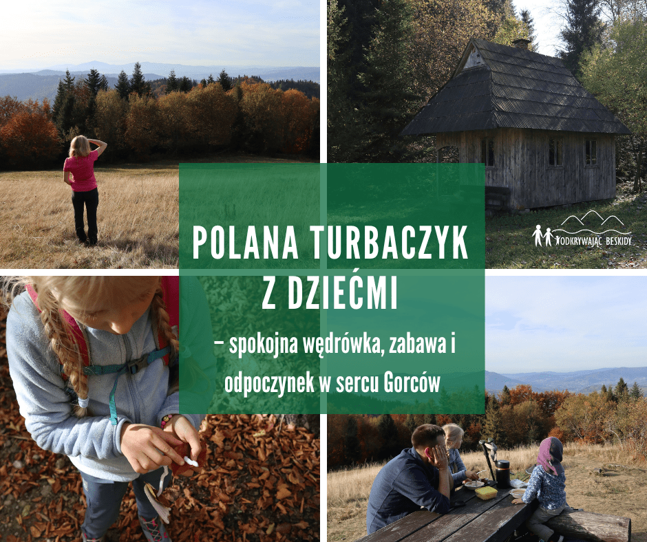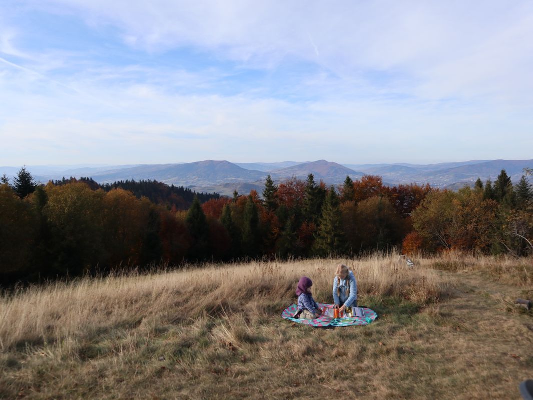 Po kilkudziesięciu minutach marszu dotarliśmy na Polanę Turbaczyk – rozległą, spokojną przestrzeń położoną na wysokości ok. 1000 m n.p.m. Widoki na Gorce i Babią Górę są po prostu bajeczne. Rozłożyliśmy koc, dzieci się bawiły się i czytały na kocu, a my w końcu… po prostu usiedliśmy z książką i kubkiem herbaty z termosu.