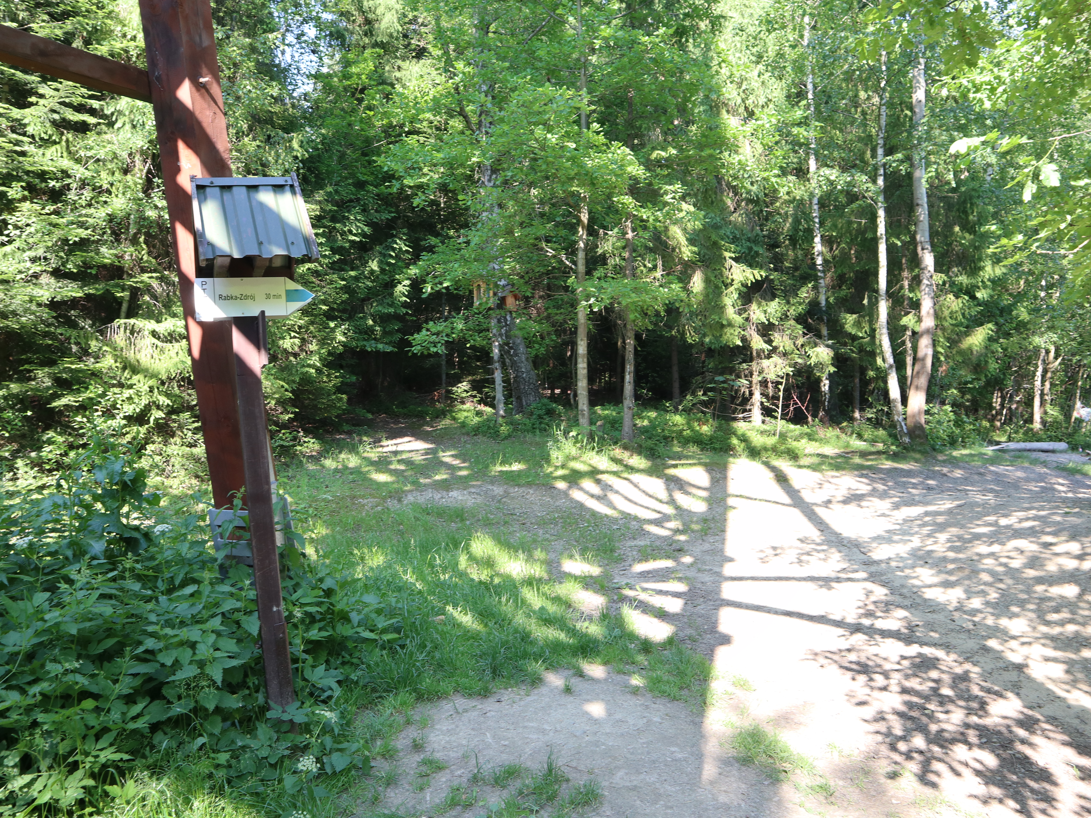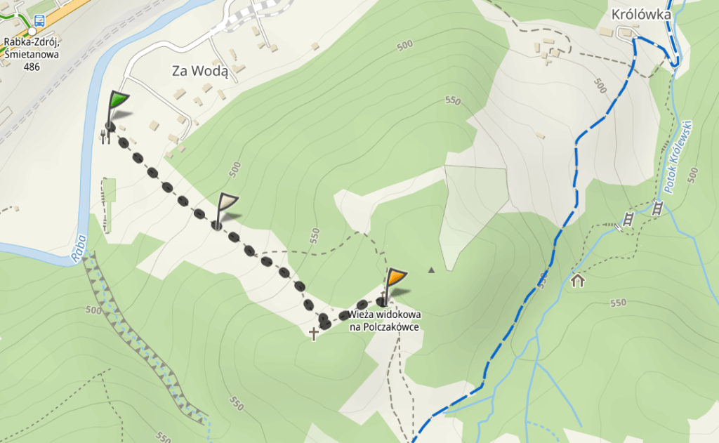 Niebieski szlak z Rabki-Zaryte – krótszy i łatwiejszy wariant (1,7 km, ok. 45 min), prowadzi przez las, idealny na rodzinny spacer do wieży widokowej na Polczakówce.