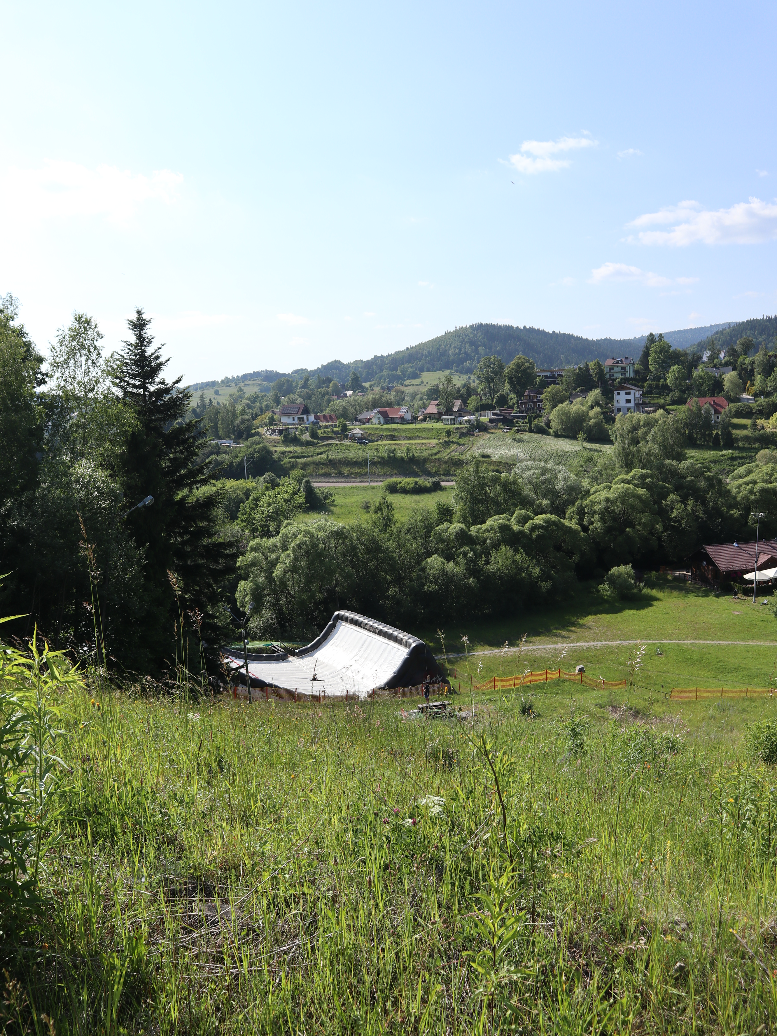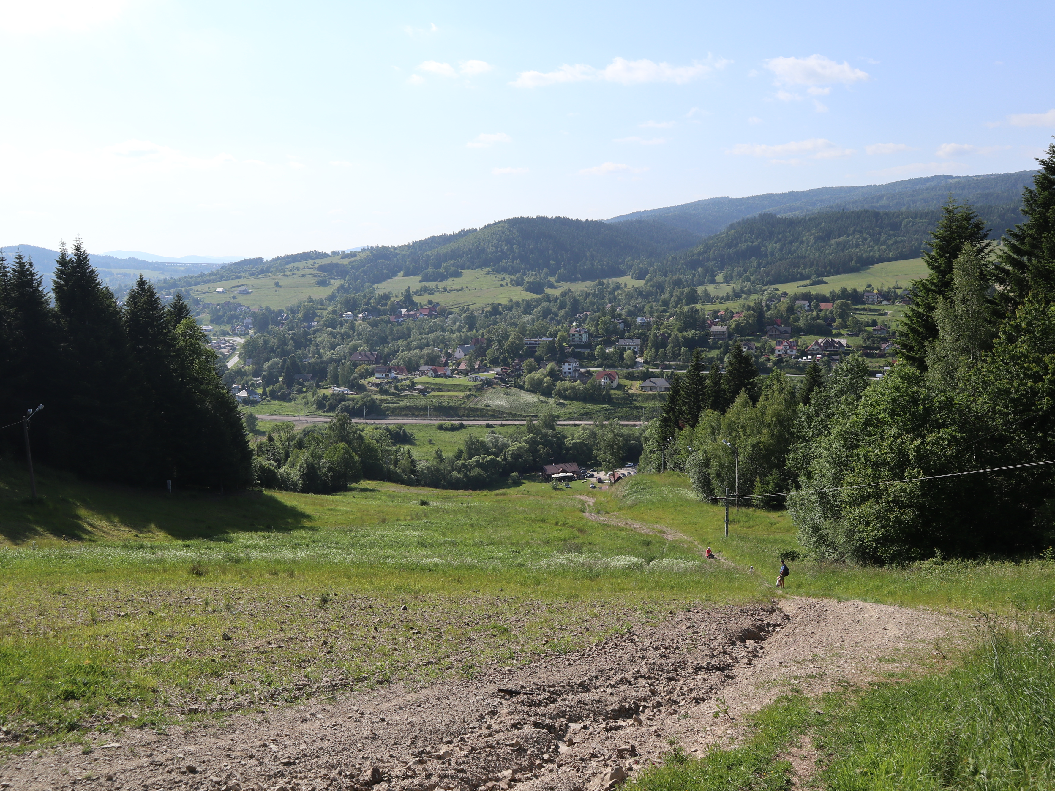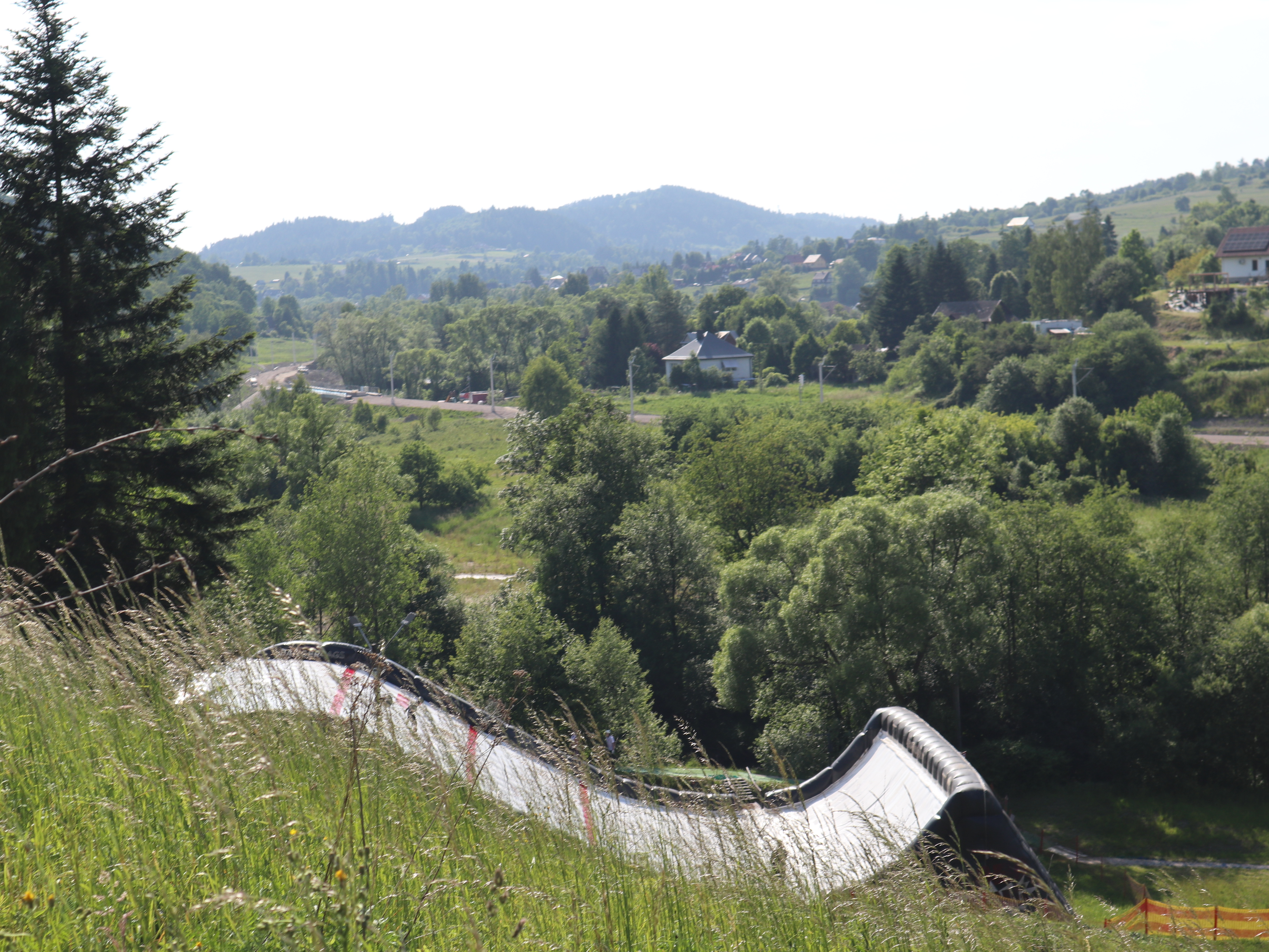 Szlak nie prowadzi przez las, tylko po otwartym zboczu stoku narciarskiego – dzięki temu przez całą drogę mamy piękne widoki na Rabkę, Gorce i Pasmo Lubonia Wielkiego. Na szczyt weszliśmy w około 30 minut, razem z piątką dzieci: trzech 7-latków i dwie 3-latki – czyli ekipa pełna energii i ciekawości! Na dole, przy stoku jest RabaBang – pierwsza w Polsce całoroczna poduszka treningowa typu Landing Pad. Trafiliśmy akurat na treningi. Zawodnicy ćwiczyli akrobacje na nartach, a dzieci co jakiś czas zatrzymywały się nie tyle, by odetchnąć, co patrzyć jak zahipnotyzowane, bo z góry to widowisko wygląda świetnie.