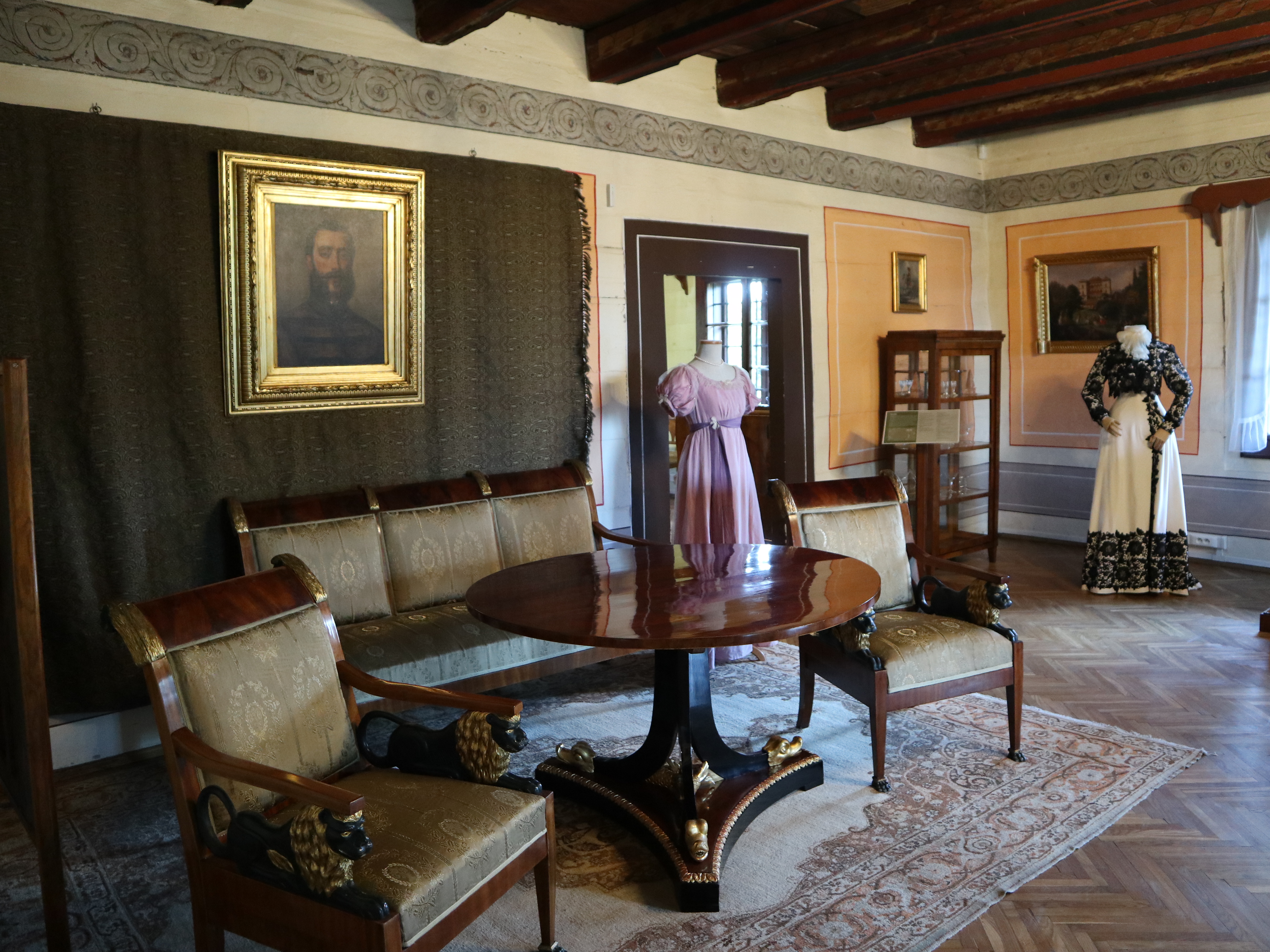 - Wnętrza polskiego dworu z XIX wieku – salon, jadalnia, gabinet i sypialnia wyposażone w autentyczne meble i detale, oddające ducha epoki.