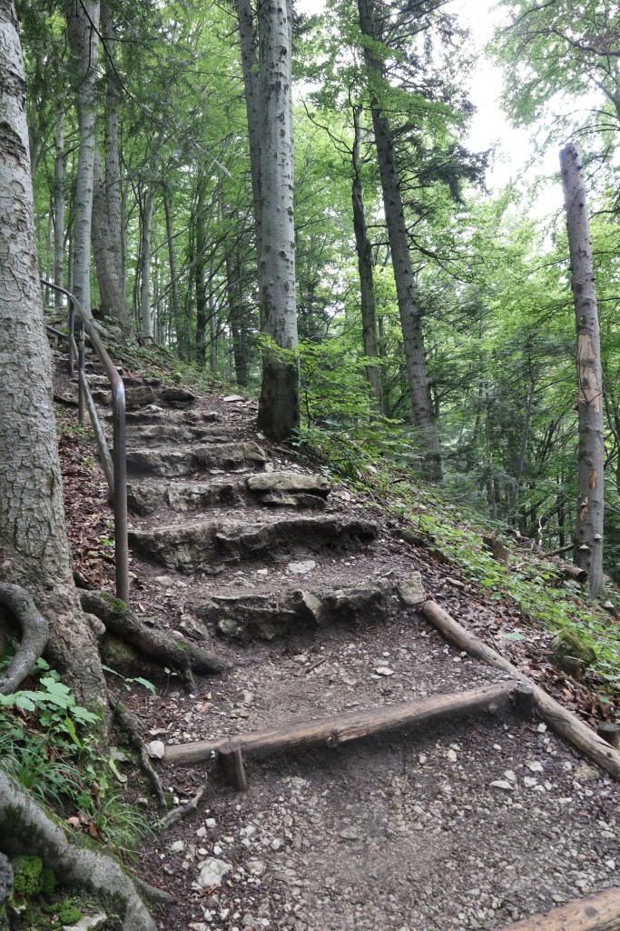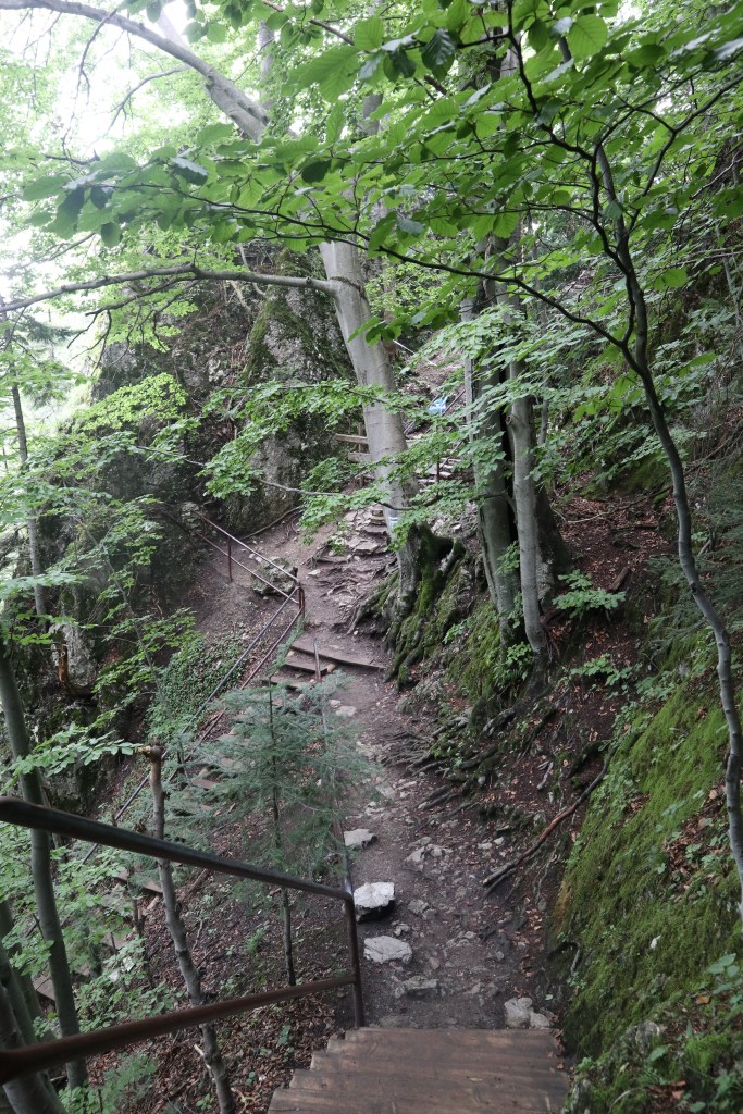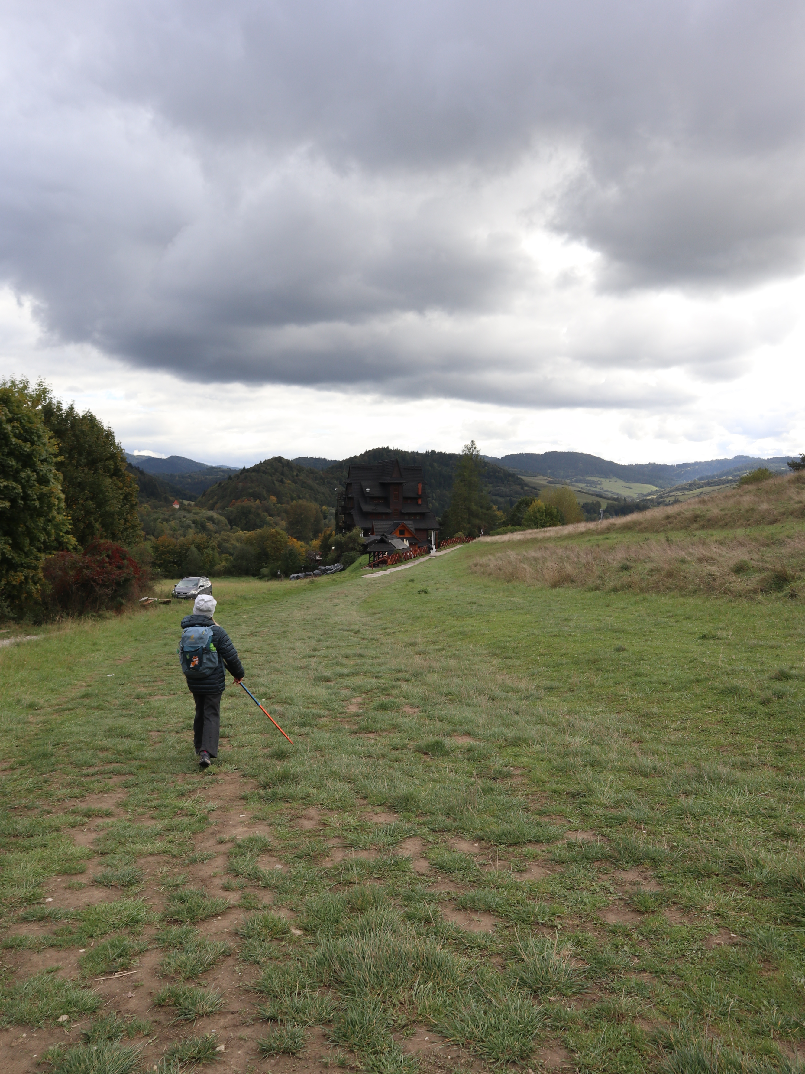 Najpierw szliśmy dalej niebieskim szlakiem, a na Polanie Kosarzyskiej odbiliśmy na zielony szlak. Tym razem odpuściliśmy Górę Zamkową – zostawiamy ją sobie (i Wam!) na kolejny raz. Byliśmy tam wcześniej i wiemy, że warto – to świetny dodatek do trasy przy dobrej pogodzie. I choć zejście też nie należy do delikatnych, to trasę pokonaliśmy bardzo sprawnie.