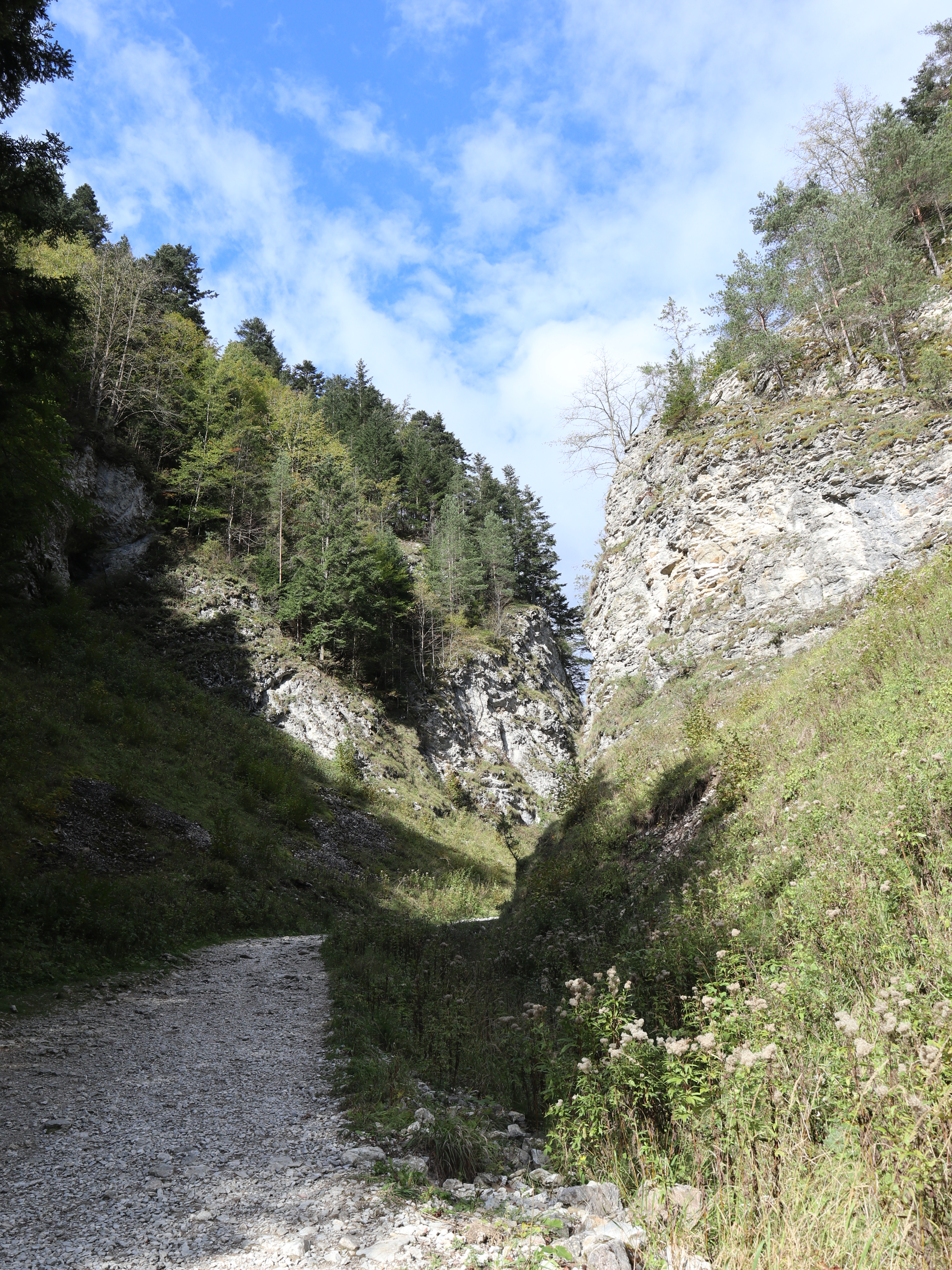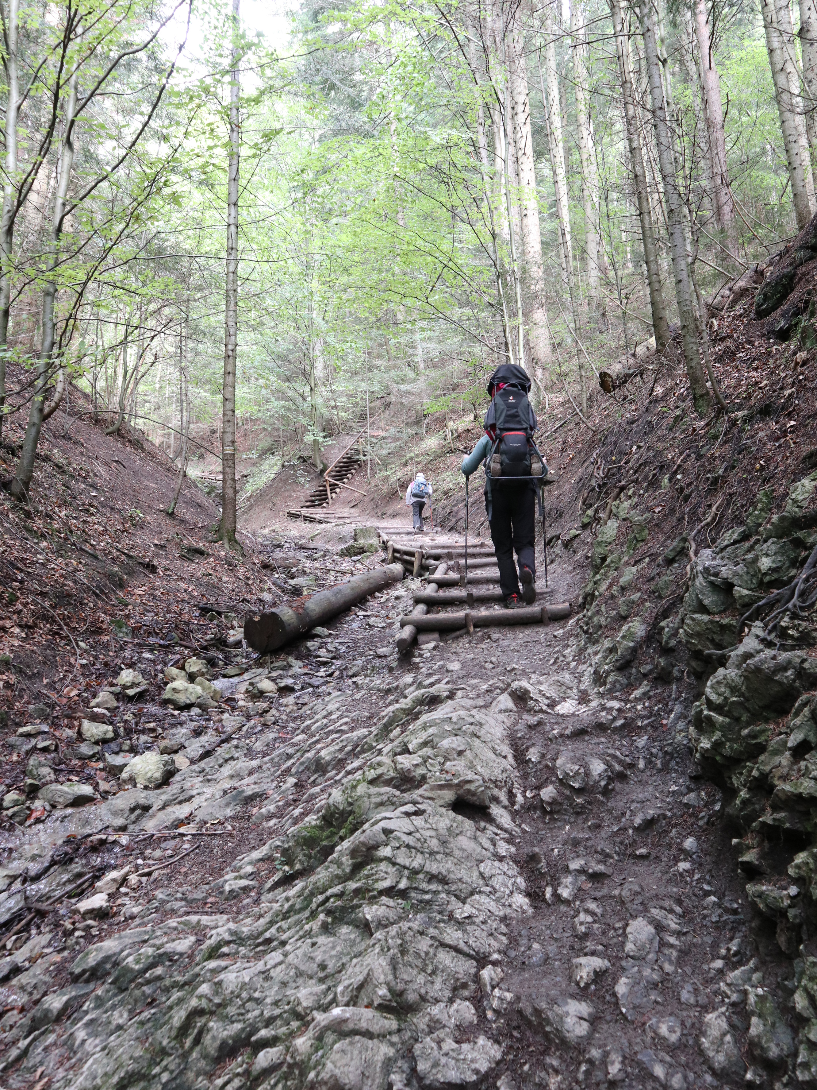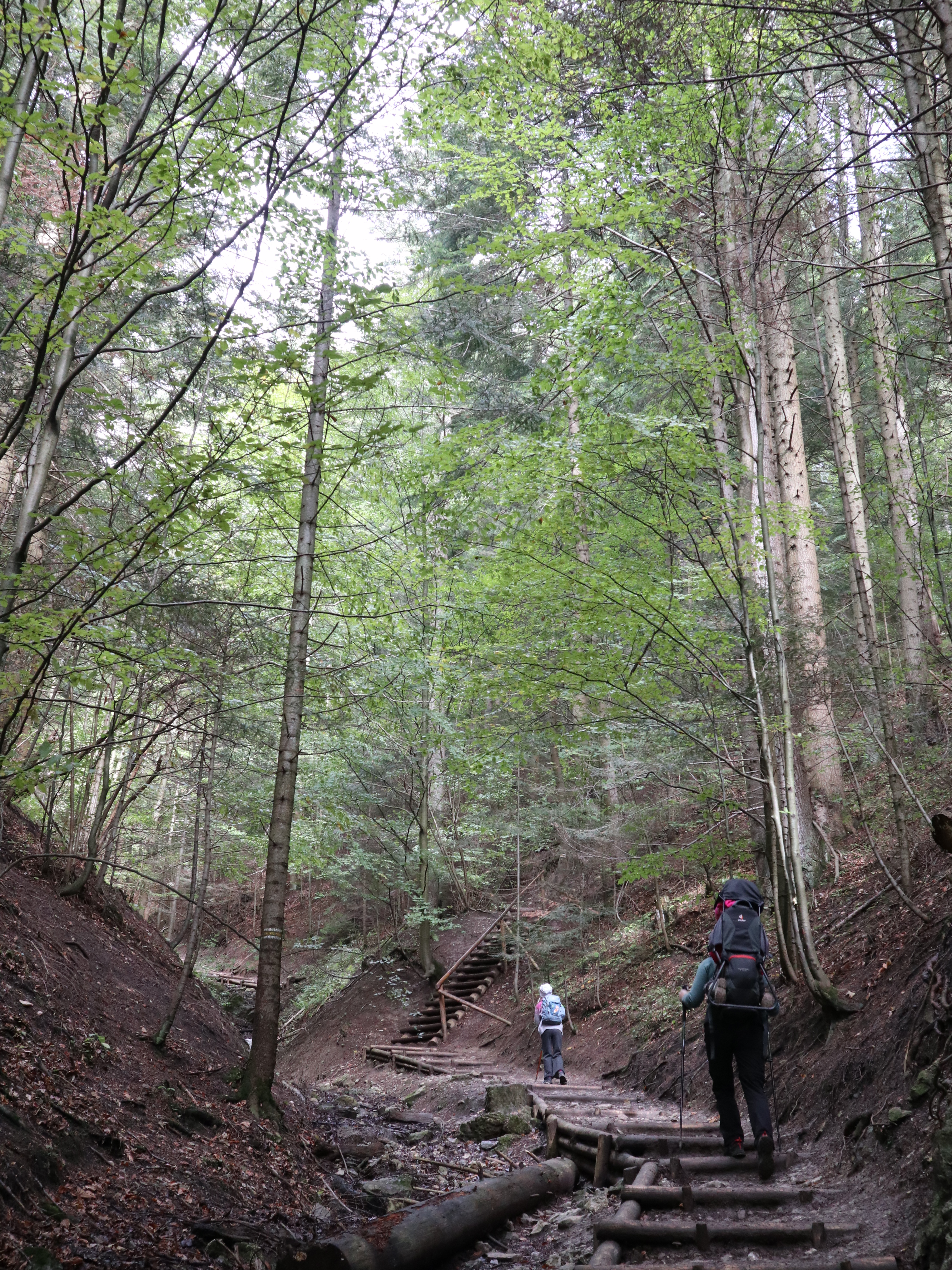 Poranek był idealny – błękitne niebo, chłodny, jesienny zapach lasu i pierwsze złote liście pod nogami. Szlak prowadził nas w górę najpierw przez piękny Wąwóz Szopczański. Chyba pierwszy raz szliśmy tędy, gdy było tak cicho, spokojnie i pusto. Można się było poczuć jak w krainie z bajki. Potem szlak wiedzie przez las – tutaj nie brakuje przygotowanych stopni, które na chwile znikają ciut przed Przełęczą Szopka. W tym miejscu z pięknym widokiem na ośnieżone już Tatry zrobiliśmy sobie przerwę. Coś na ząb, łyk ciepłej herbaty i wyruszyliśmy ostatni fragment pod górę.
