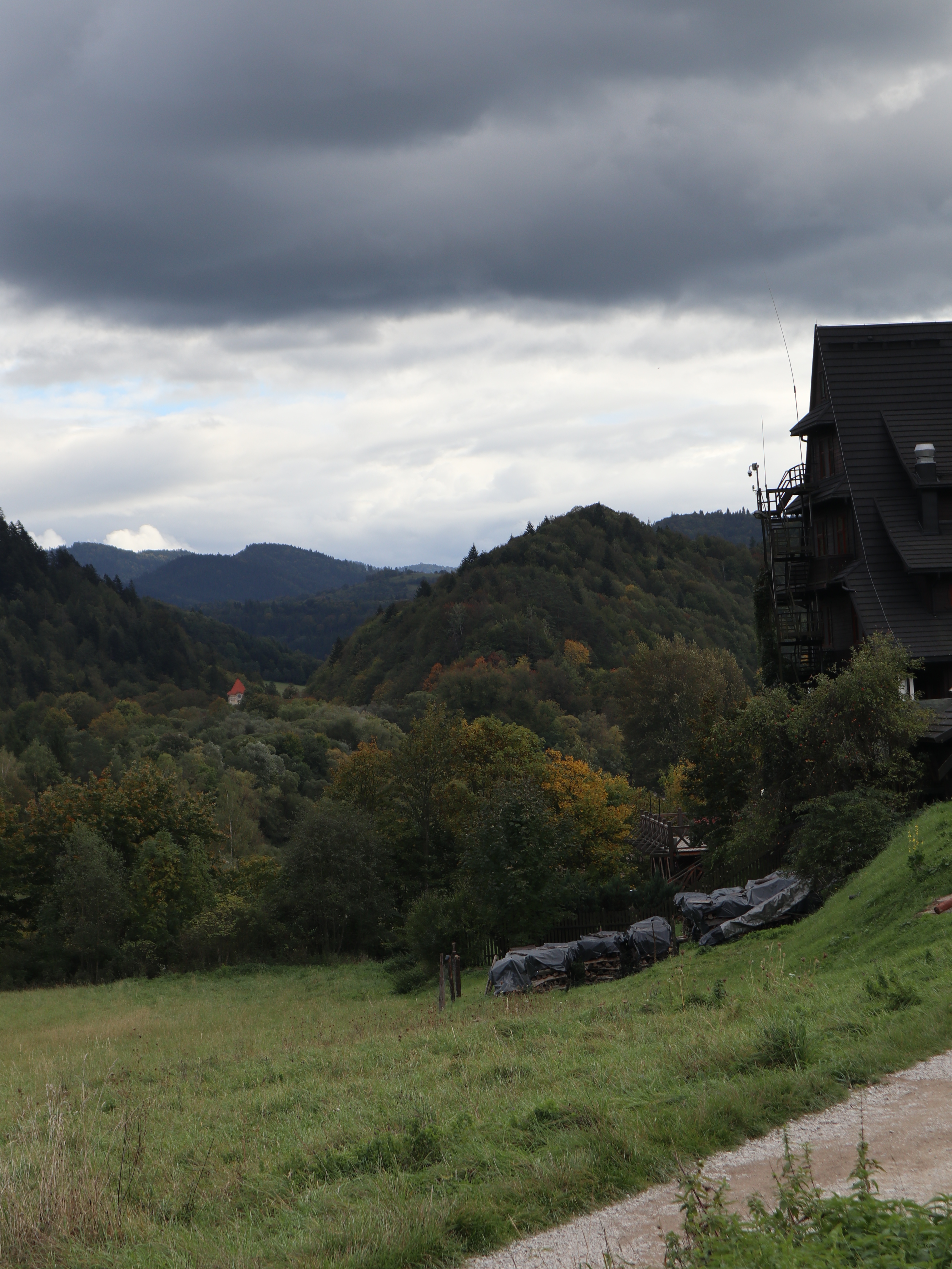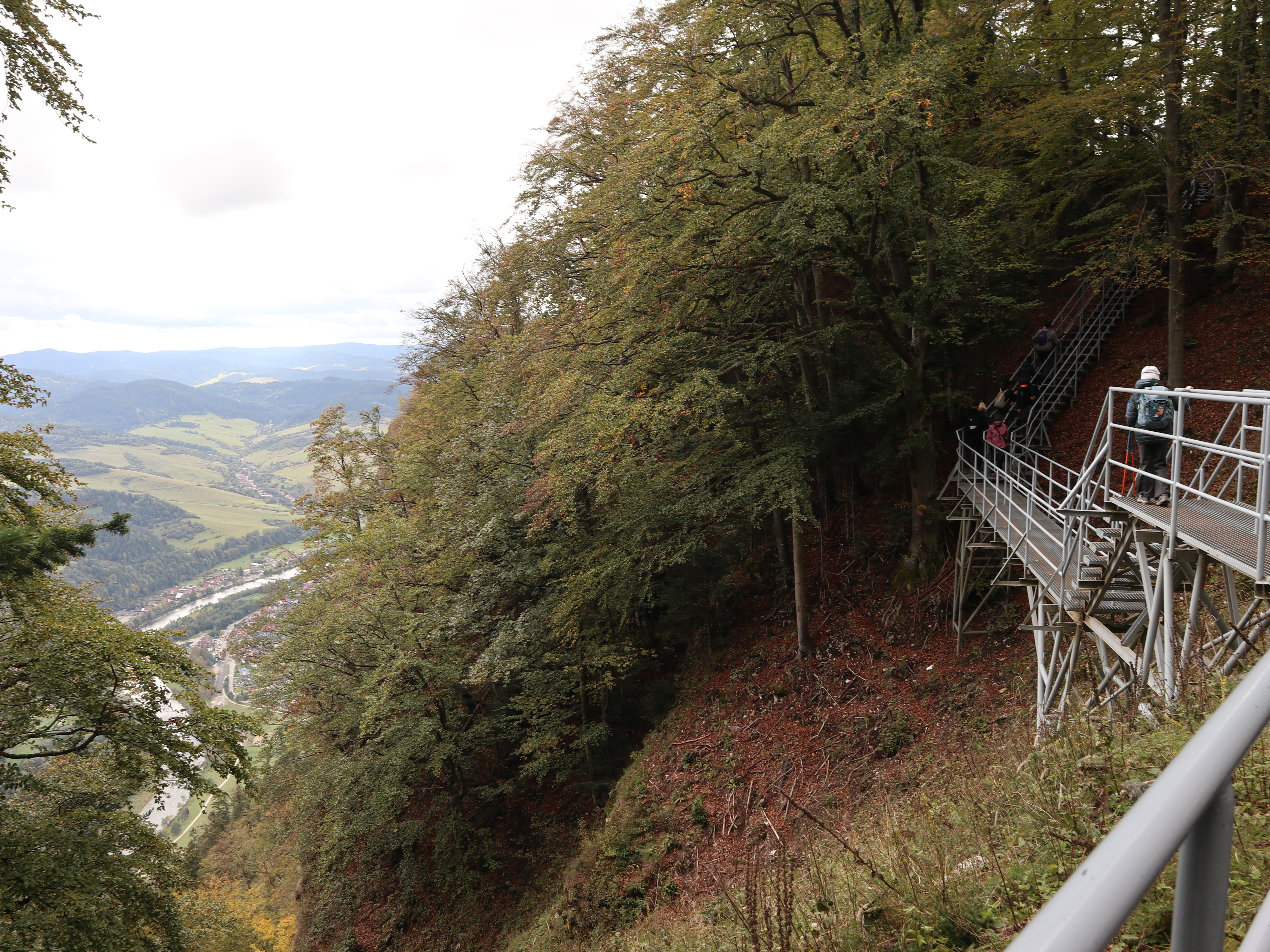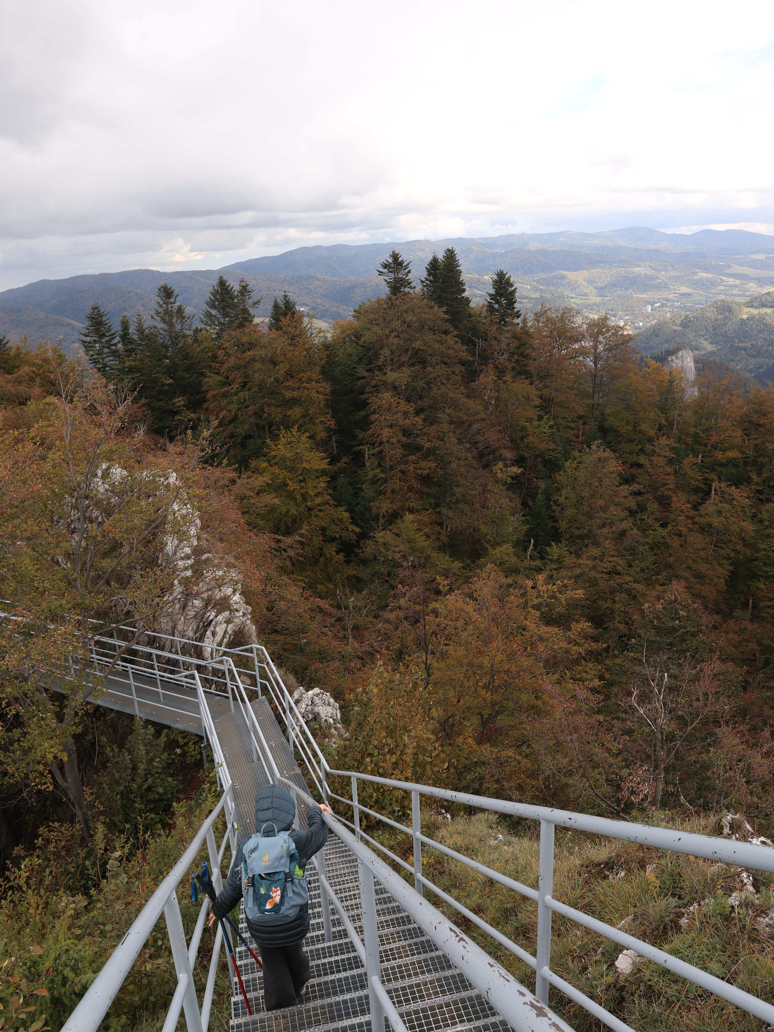 Trzy Korony – tworzy tak naprawdę pięć turni szczytowych. Najwyższą z tych formacji skalnych jest Okrąglica. Na jej wierzchołku jest niewielki taras widokowy, na który wchodzi się po stalowych pomostach i schodach. Ruch na nich jest dwukierunkowy. Widok jak zawsze zapiera dech – morze gór i dolin, słońce przemykające między chmurami. Na szczycie możecie podziwiać przepiękną panoramę na Pieniny, Tatry, Dolinę Dunajca, Beskid Sądecki, Gorce i Tatry. I choć Tatry chowały się już nieco w chmurach, to okolica wyglądała przepięknie. Ale w oddali widać było już, że nadciąga deszcz.