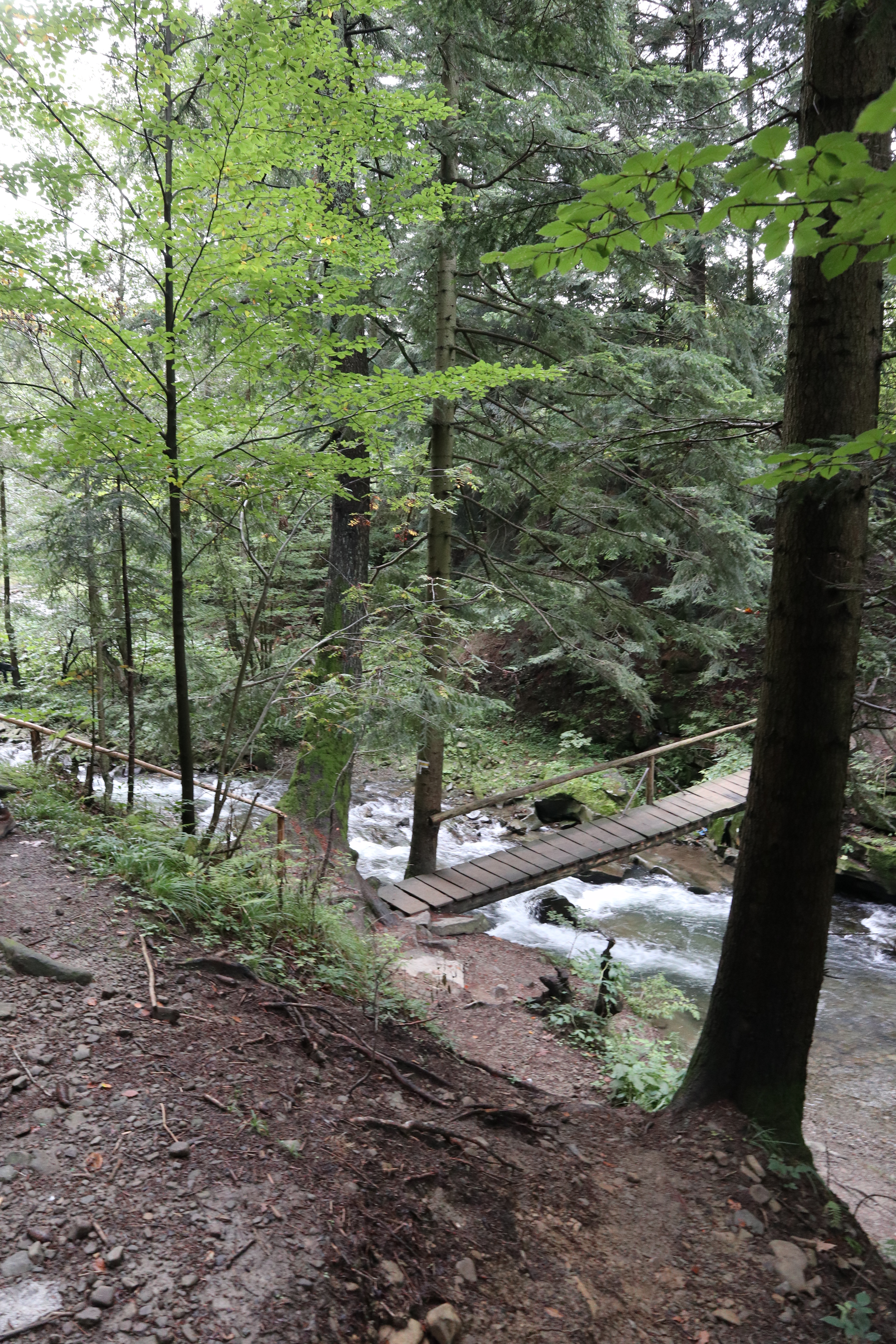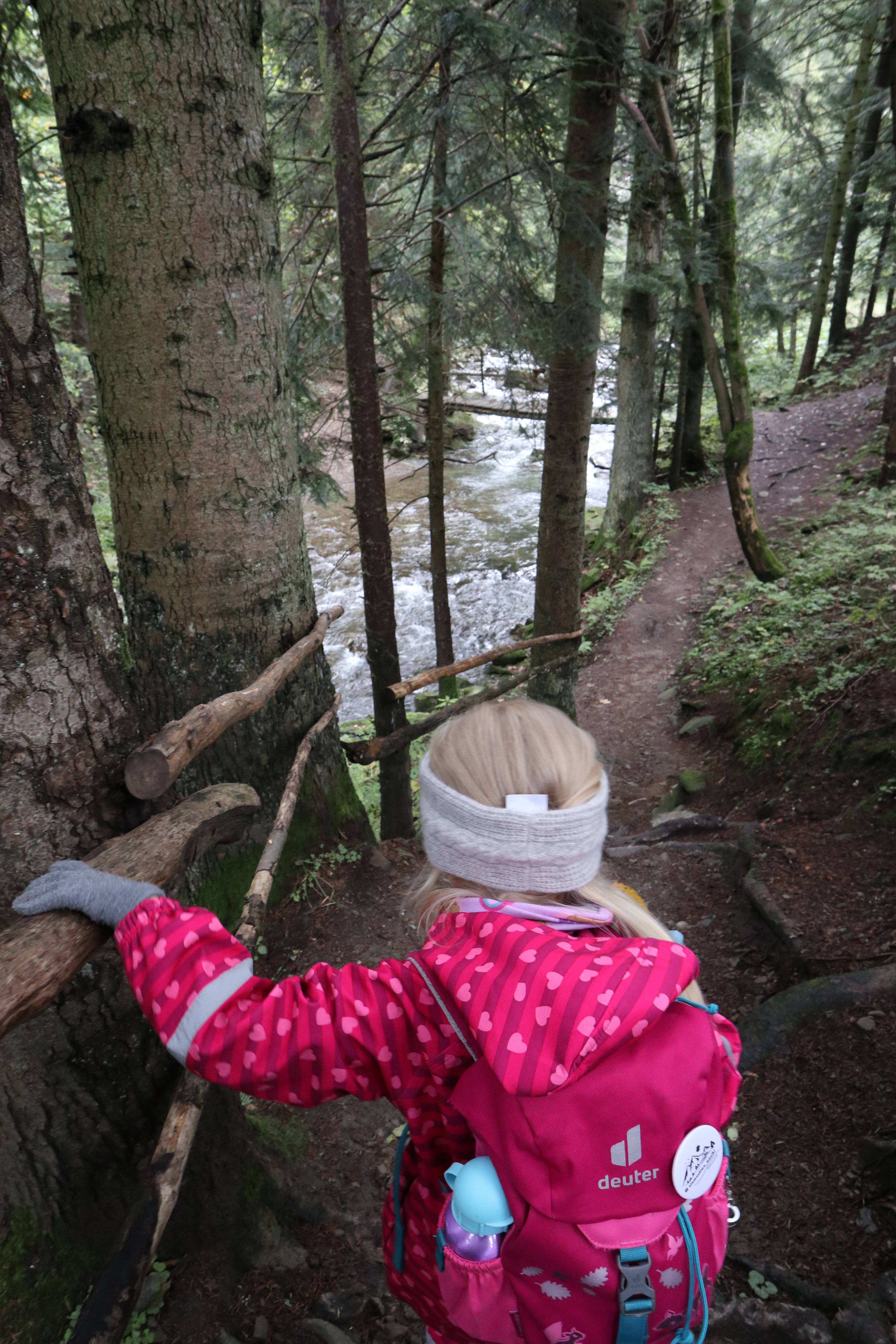Startowaliśmy z Zawoi, kierując się żółtym szlakiem w stronę Mosornego Gronia. Już na początku na dzieci czekała pierwsza atrakcja i wyzwanie jednocześnie – przejście przez rzeczkę Jaworzynkę po drewnianej kładce. Jak się okazało, dla najmłodszych to był prawdziwy punkt programu! Wąska kładka, zawieszona wysoko nad strumieniem, to dla najmłodszych nie lada wyzwanie.
