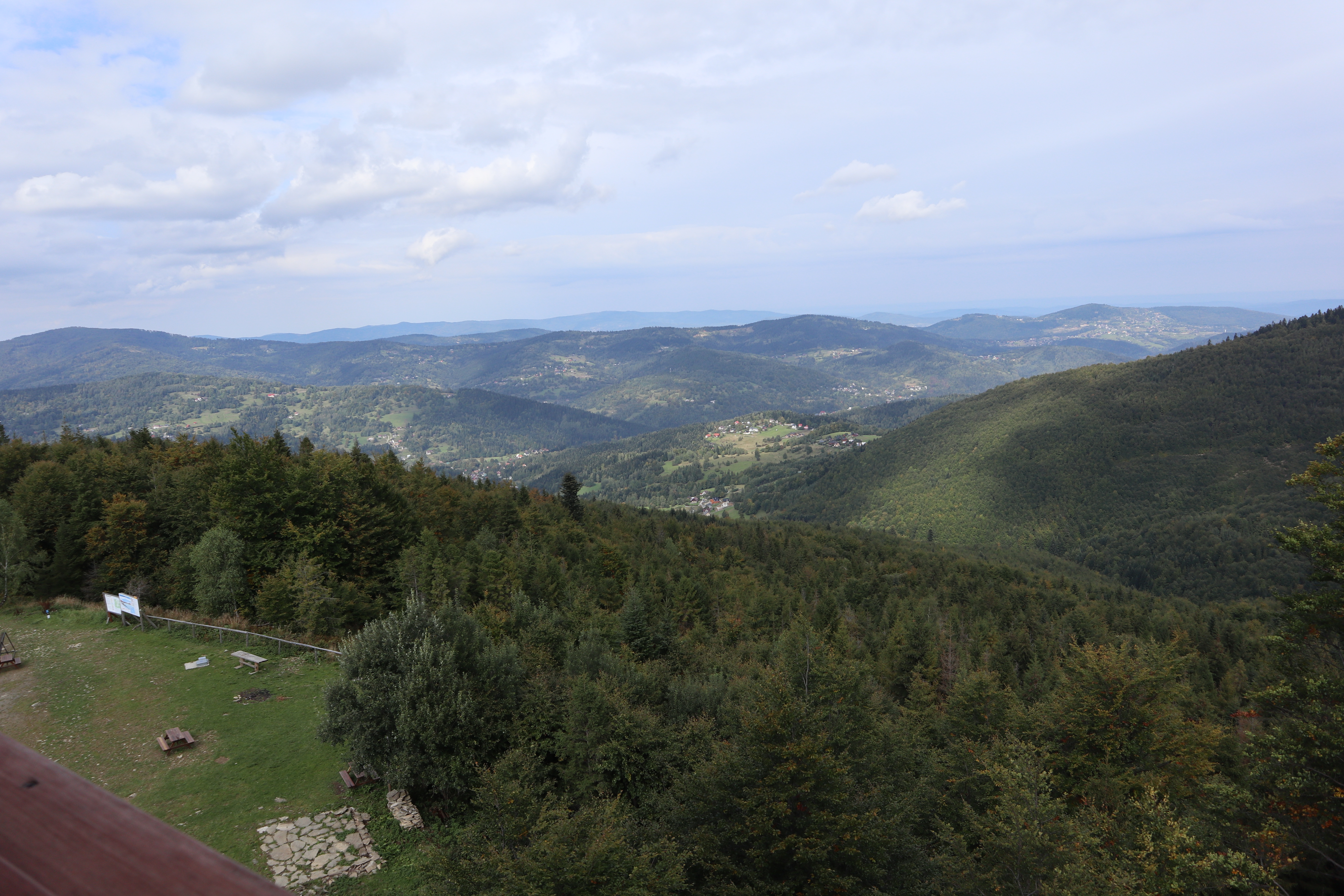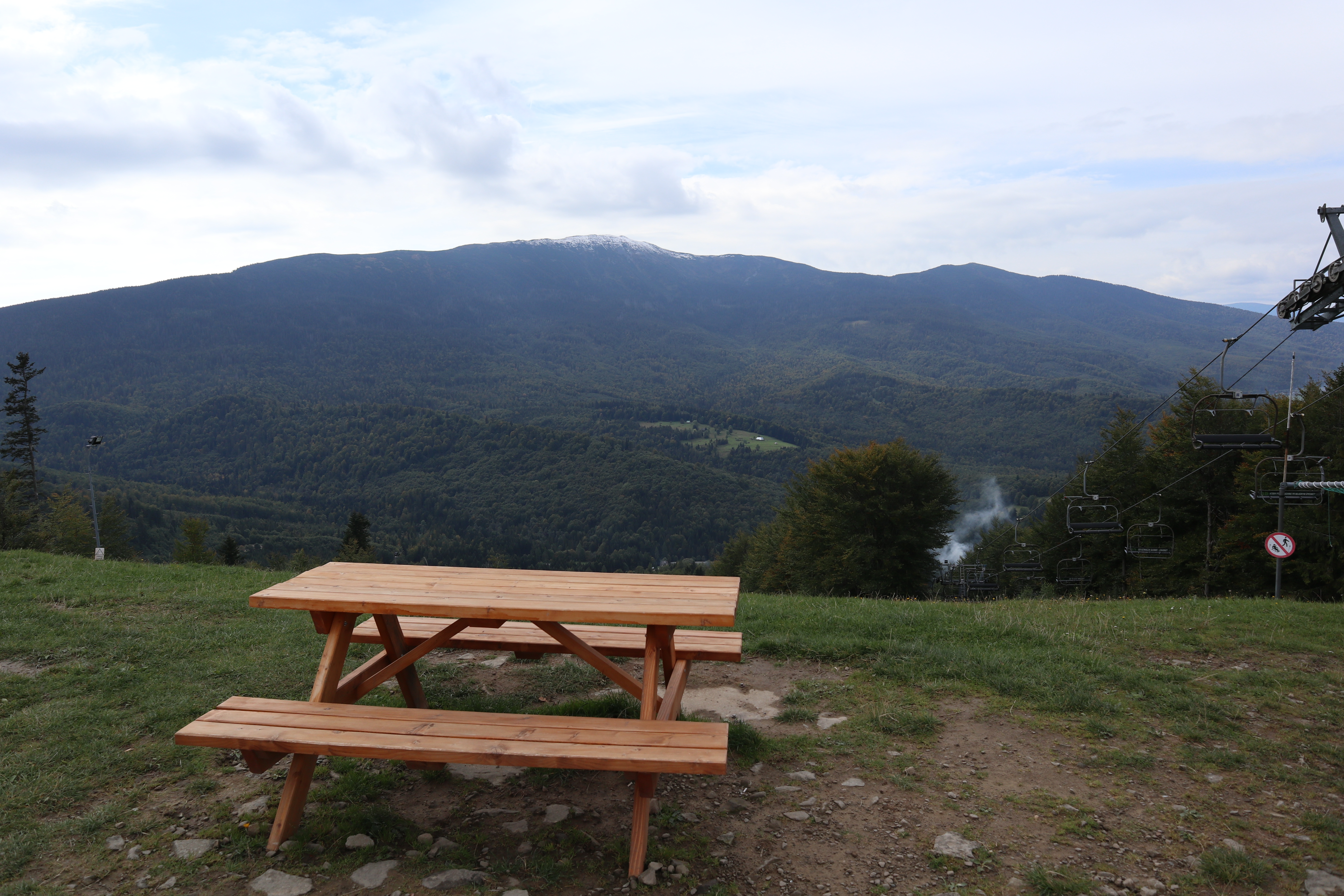 Obok znajdują się ławeczki i stoły, więc to świetne miejsce na dłuższy postój. My zabraliśmy ze sobą termos z domową zupą – nic tak nie smakuje w górach jak ciepły posiłek z widokiem na Królową Beskidów. Jest też ławeczka na któreż wyrzeźbiono nazwę szczytu – świetne miejsce, by zrobić sobie zdjęcie.