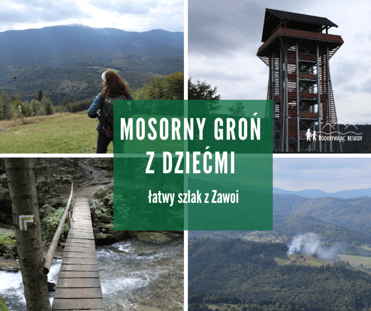 Na szczycie Mosornego Gronia (1047 m n.p.m.) czeka drewniano-stalowa wieża widokowa, z której rozciąga się fantastyczna panorama na okolicę. Ale co tutaj jest najlepsze, to fakt, że nawet bez wychodzenia na wieżę można podziwiać – moim zdaniem- najpiękniejszy widok na Babią Górę, dumnie górującą nad całą Zawoją.