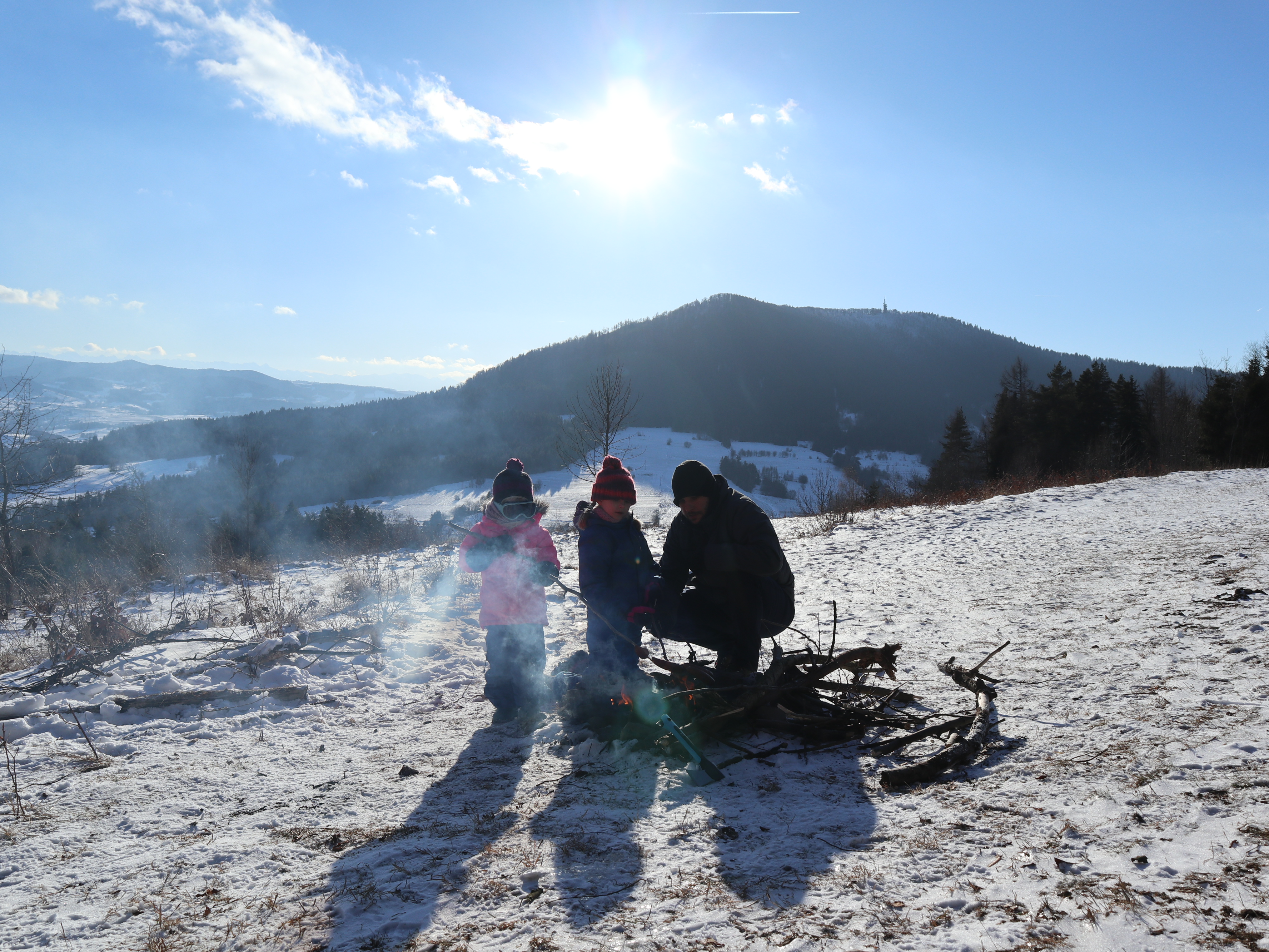Zima potrafi być kapryśna – rozpalenie ogniska w mroźny, wietrzny dzień nie było najłatwiejsze, ale jak już się udało… to kiełbaska smakowała znakomicie, a gorąca herbata z termosu po mroźnym spacerze to prawdziwa nagroda.