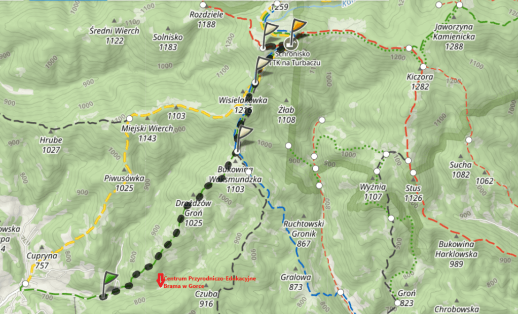Na opisywanym szlaku znajduje się możliwość odbicia do Centrum Przyrodniczo-Edukacyjnego „Brama w Gorce”. To miejsce: