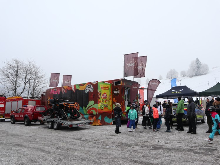 Jedną z największych atrakcji wydarzenia był Wawel Truck, który tego dnia zaparkował tuż przy stoku. Kolorowa ciężarówka marki Wawel przyciągała dzieci jak magnes – i trudno się dziwić. W środku czekały interaktywne gry, wirtualny rollercoaster, magiczne lustro oraz strefa Królestwa Dobrego Smaku.